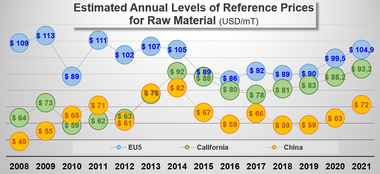 The generalized increase has similarly affected the levels of prices paid for tomatoes as raw material in Europe also. Growth reached 5% in Northern Italy, exceeding 12% in Spain and 9% in Portugal, with the result that average values in Europe (approximately EUR 83.5 /mT) have risen in 2021 by 7% compared to what they were in 2020 and by 10% compared to the average of the three previous seasons (2018-2020). So the indicative reference price for processing tomatoes in Europe (expressed in USD per tonne) remains the highest throughout the world's main processing regions.