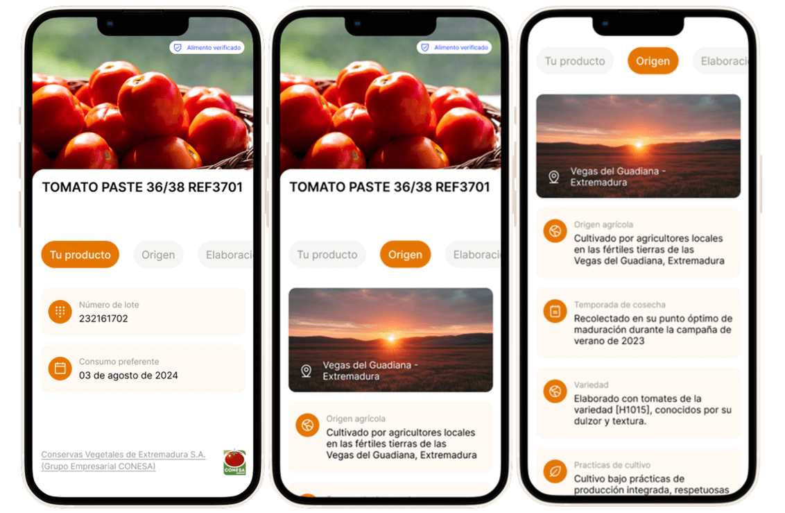 With this tool, the last link in the chain (in this case, processed tomatoes) generates a label containing a QR code that can be read by any mobile device, providing an interface that displays the following information: