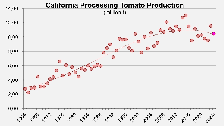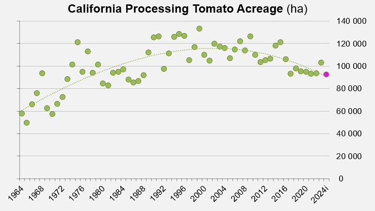 As of May 15, California’s tomato processors reported they have or will have contracts for 11.5 million tons (10.433 million t) of processing tomatoes for 2024. This production estimate is 1 percent below the January intentions forecast of 11.6 million tons and 10 percent below the final 2023 contracted production.