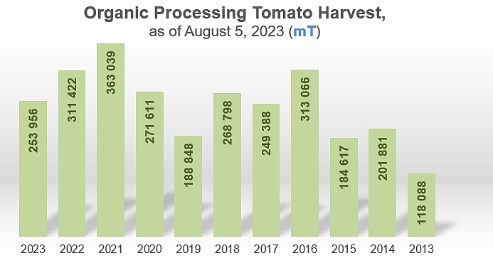 The 2023 California Organic processing tomato deliveries for the week four (ending August 5th) were 78,282 mT (86,299 sT). The total tons YTD for week four is 253,956 mT (279,939 sT), or 19% of the actual total delivered quantities.
