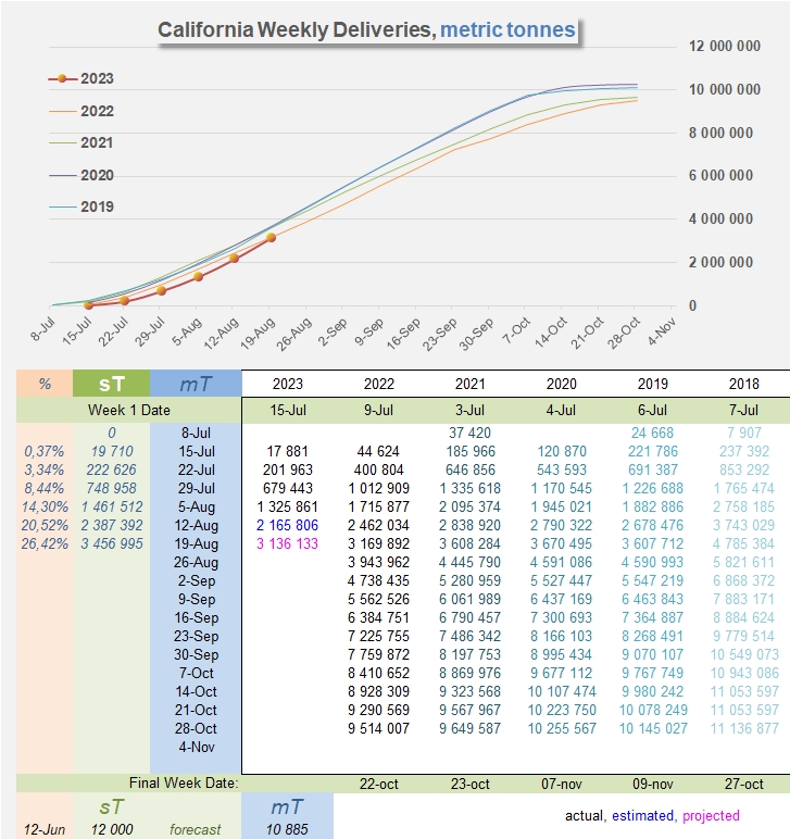 If the weekly projections come true, the projected quantities on August 19 would represent approximately 26% of the California processors' target. (10.89 million mT).