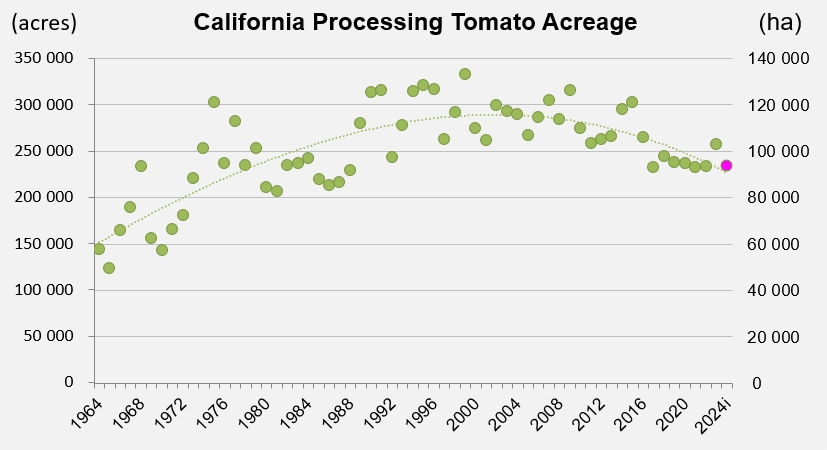 The state’s tomato processors planned to contract for 10.5 million metric tonnes (t) (11.6 million short tons) this year, down about 10% from the 11.7 million t (12.9 million tons) they contracted for in 2023, according to a January report from the U.S. Department of Agriculture.