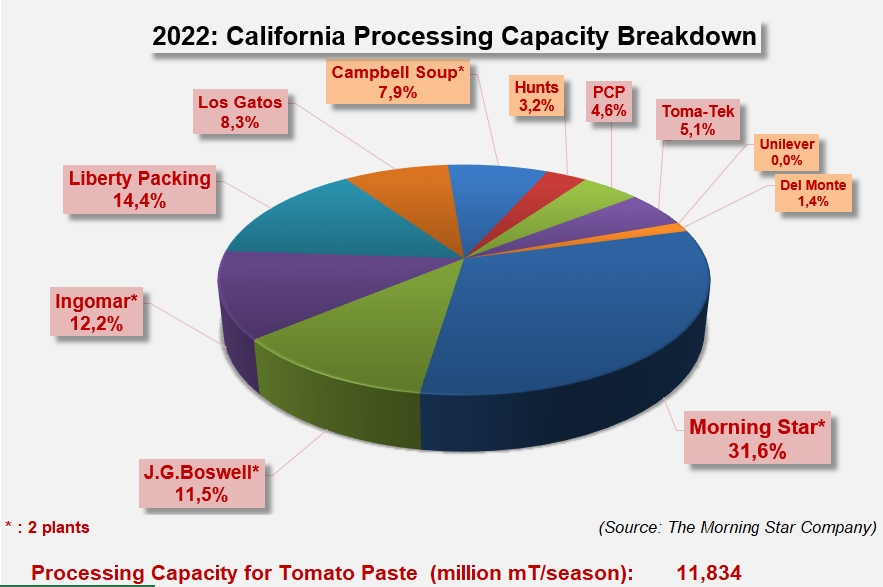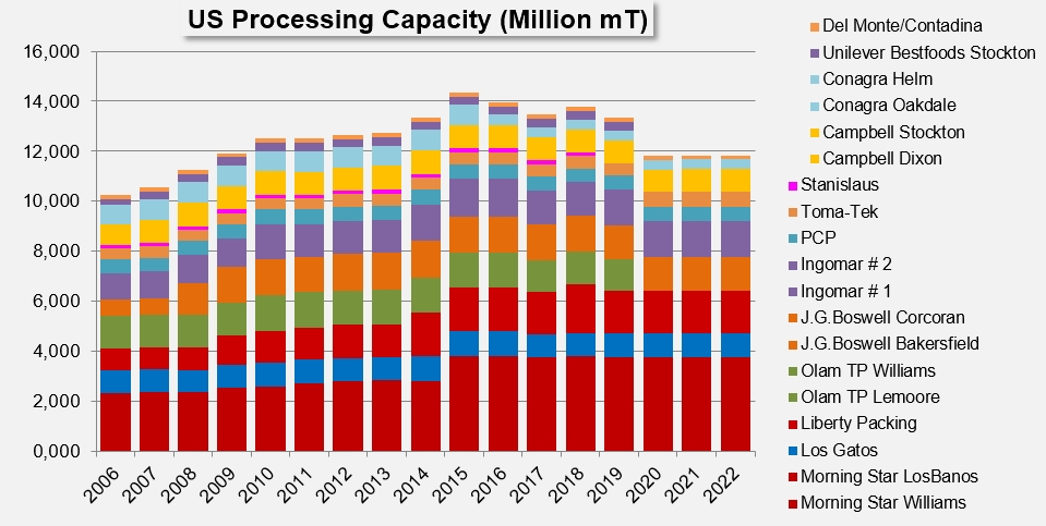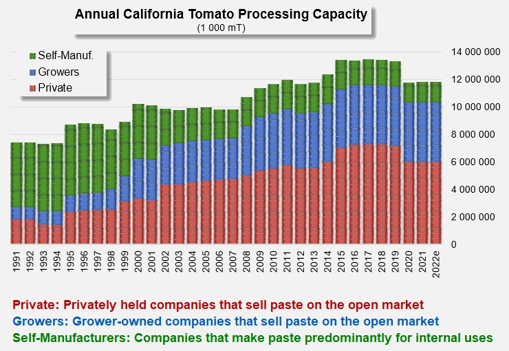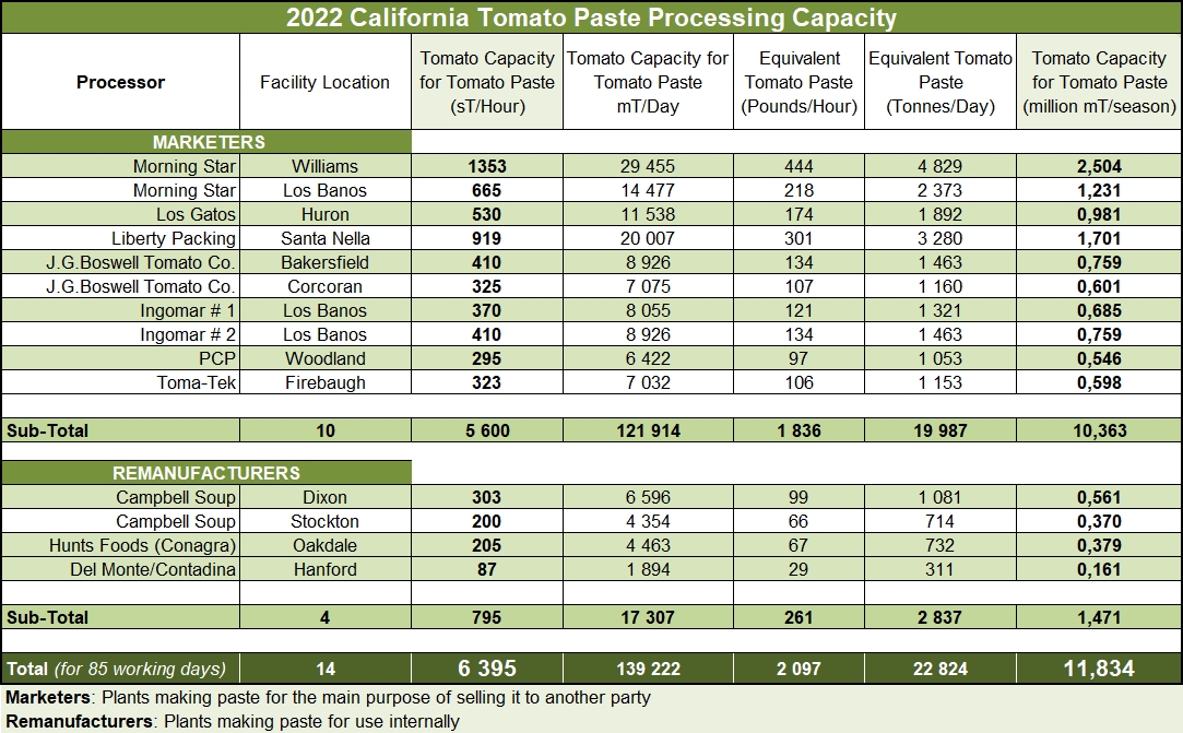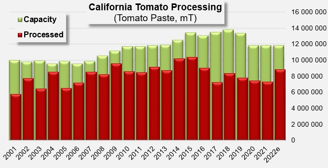For the third year in a row, after Olam's plants ceased operations in 2020, California's industrial tomato processing capacity in 2022 will be around 140,000 mT per day, or about 12.7 million mT (14 million sT) for a season lasting over three months.
