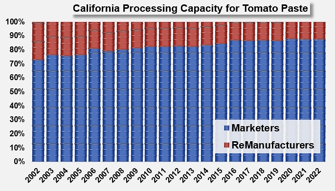 Processing capacity is mostly held by "marketers", which are companies that produce tomato pastes mainly for sale to secondary users. In 2022, their share will represent nearly 88% of California's industrial processing base, with the remaining 12% held by "remanufacturers", companies whose production is intended to be reused internally.