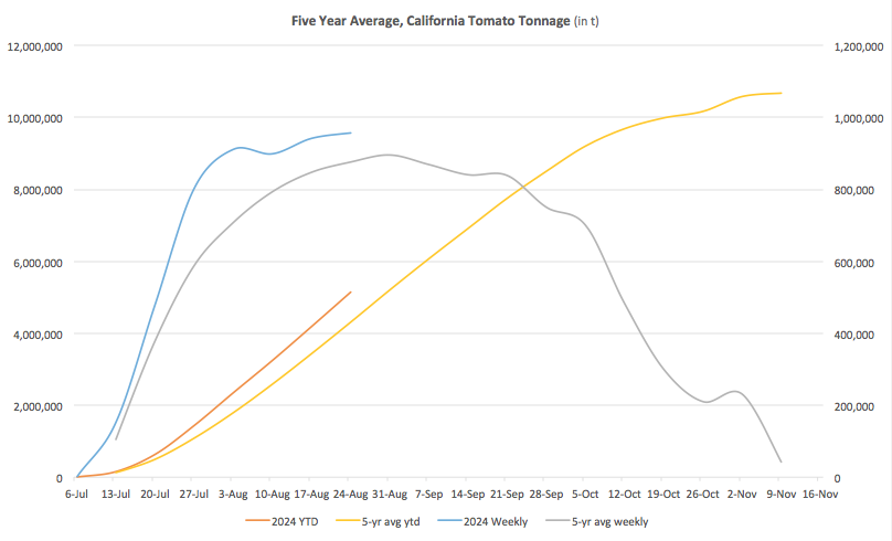 If the weekly projections come true, the projected quantities on August 24th would represent approximately 49% of the California processors' target (10.43 million t) and would be 19.4% above the average quantities delivered on the same date over past five years.