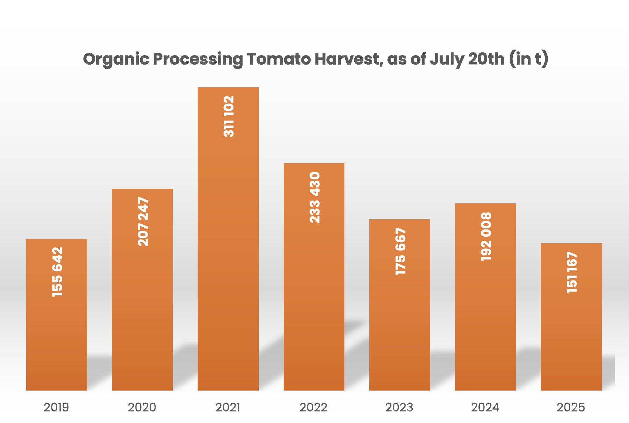 The 2025 California Organic processing tomato deliveries for the week three (ending July 20th) were 73,242 t (80,736 short tons).