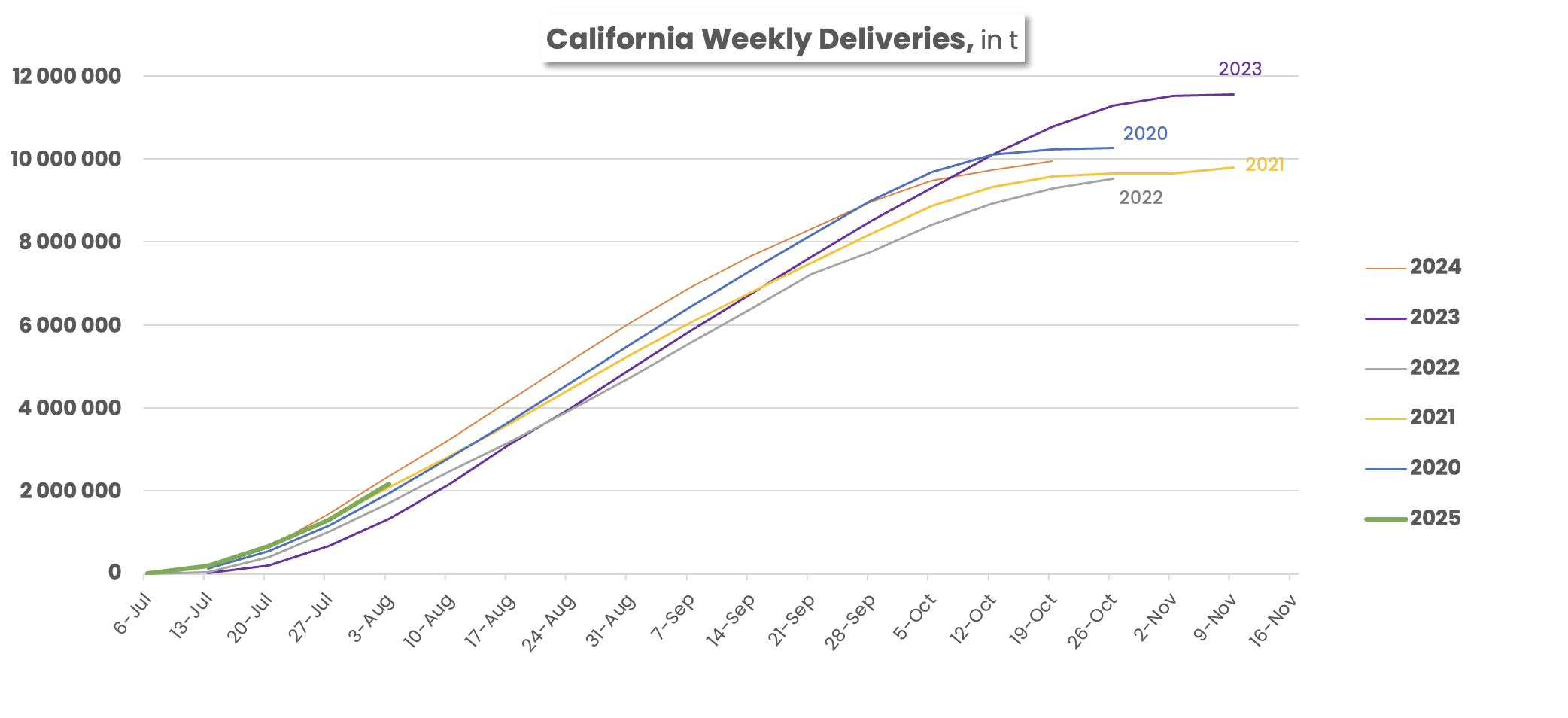 If the weekly projections come true, the projected quantities on July 27 would represent approximately 14% of the California processors’ target (9.34 million t) and would be 20.8% above the average quantities delivered on the same date over past five years.