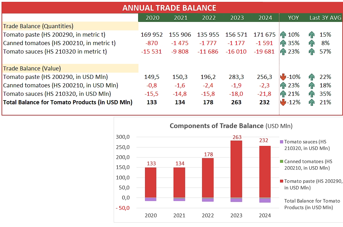 The Chilean trade surplus in tomato derivatives is built exclusively on exports of tomato concentrate (HS code 200290): in 2024, the total surplus amounted to USD 232 million, down USD 31 million (-12%) compared to 2023, but still 21% higher than the 2021-2023 average. Exports of tomato concentrate generated a surplus of approximately USD 256 million in 2024, significantly higher than the average of the three preceding years, but showing a decrease of USD 17 million (-10%) compared to 2023. This decline occurred even though the quantities exported in 2024 were 15,000 tonnes (+10%) higher than in 2023 and 22,000 tonnes higher than the average for the period 2021-2023.
