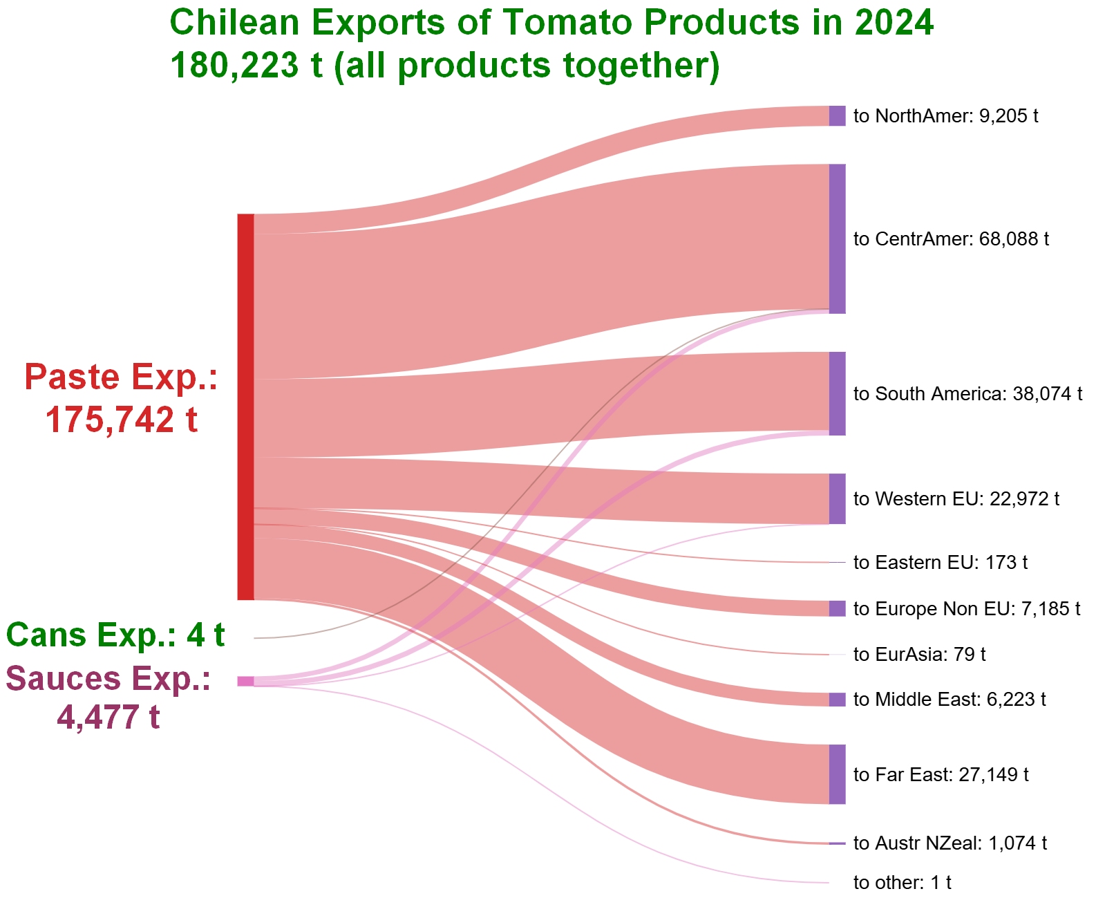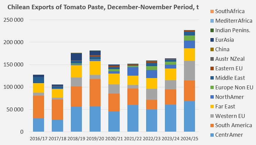 Over the twelve-month period ending in November 2025, Chile’s trade balance for tomato paste shows strong growth. A dozen or so long-standing customer countries, spread across five regions, accounted for over 77% of Chile’s export sales of concentrates in 2024, and, with the exception of Colombia (+1%), all showed very significant increases.