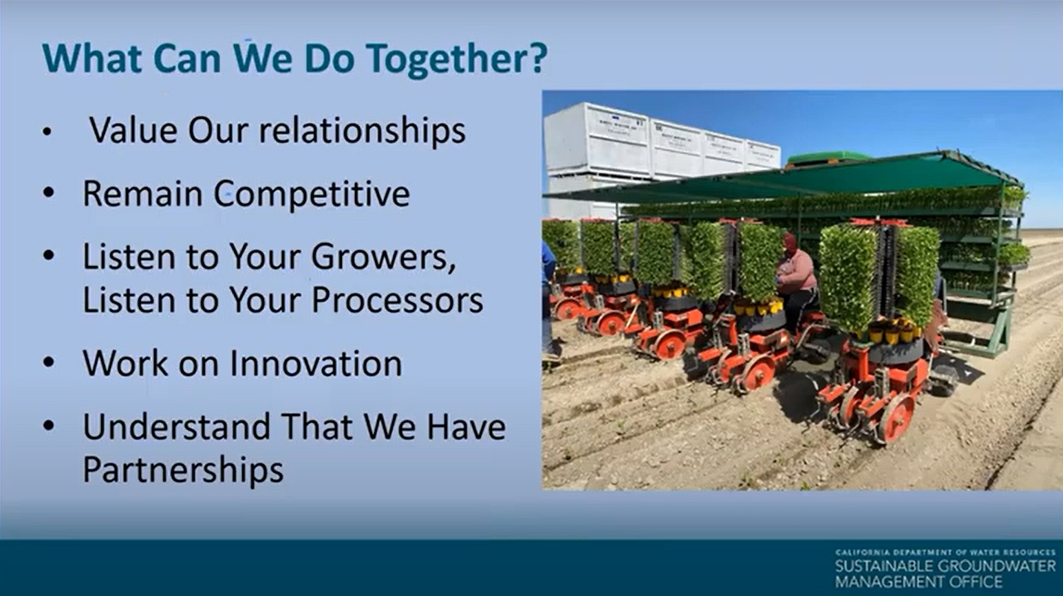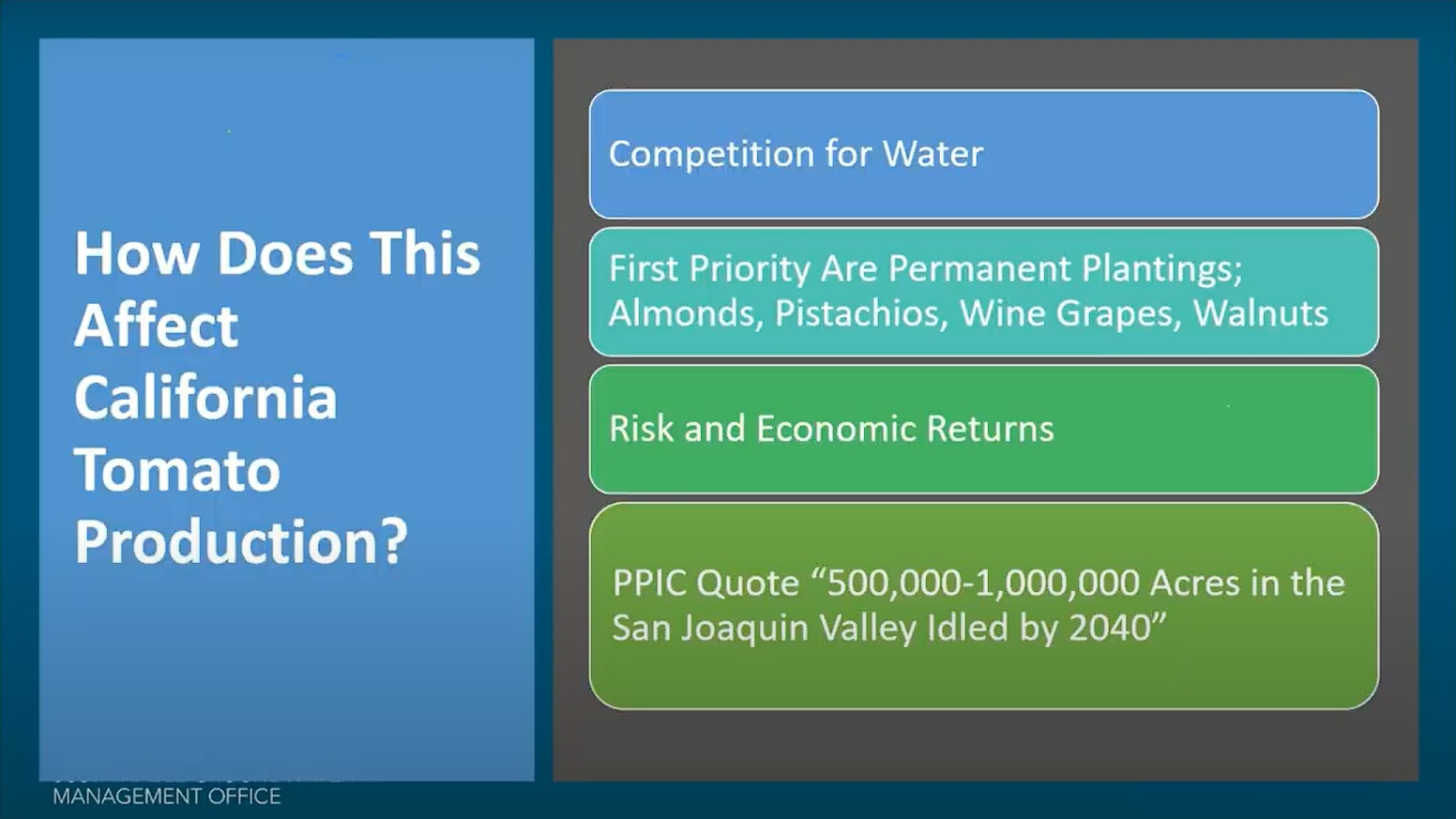 I believe that the processors that don’t understand the new reality will have a very difficult time in the future in California. The risk reward for tomatoes has been a hard-sell lately, with expenses growing for the crop and really skyrocketing. Now with climate changes, we are seeing hotter summers and lower yields. In 2021, California experienced a yield reduction in the south of the State of 25 to 40% due to heat alone. We know that the price increase was big this year, but growers are still having a difficult time and this increase may not be enough. We need to be creative, we need to rely on technology, we need to reduce labor, reduce water usage, and we need more efficient genetics. As you just heard, we need a tomato plant that will grow without water, the way things are going now. But we have seen from the charts earlier that even in a wet scenario, water is not getting to the growers. There is an increased demand for municipal and industrial use, at present, and environmental water is increasingly using more of what agriculture traditionally used. Water for salmon, to keep rivers cool during the summer and increase flows in the rivers for fish populations, as well as water demands from our Delta water users – all of these things have put pressures on our system, pressure that is redistributing water from agriculture to other uses within the State.