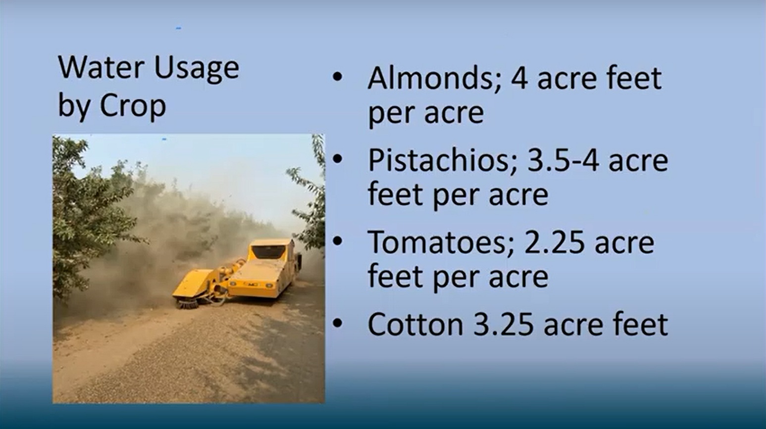There are 600,000 acres in Westlands water district. The area has relied on Central Valley Project water, and when they had a 100% allocation, that would give them 2.4 acre-feet of water per acre. During the dry years, Westlands’ water just relied on groundwater, in many cases from wells anywhere from 600 to 2,200 feet deep. Westlands Water District is in a critically overdrafted basin, and it is now beginning to implement groundwater pumping restrictions to achieve groundwater sustainability. In the past, there were no restrictions on pumping groundwater, so groundwater pumping restrictions will begin to cut back on what a grower can pump in this area. Restrictions on pumping have been proposed to only allow a maximum of seven inches of water per acre (69 mm/ha), and in cases anywhere from three to four inches of water per acre per year. As you know, tomatoes typically take around 27 inches of water per acre (109 mm/ha).