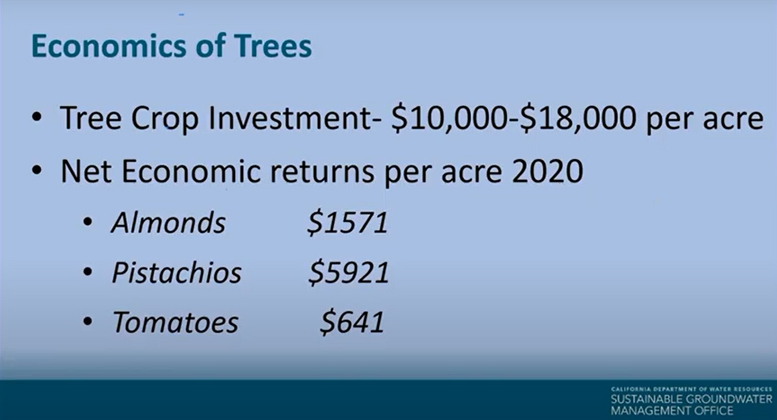 So growers have to choose what crop they are going to plant and what kind of return they are looking at long-term. Economic returns are definitely better for tree crops when compared to processing tomatoes and when we speak about risk, almonds and pistachios are less at risk than tomatoes from frost, hail, rains at the wrong time, etc. I am not saying tree crops are immune from that, but tomatoes have definitely been affected in recent years.