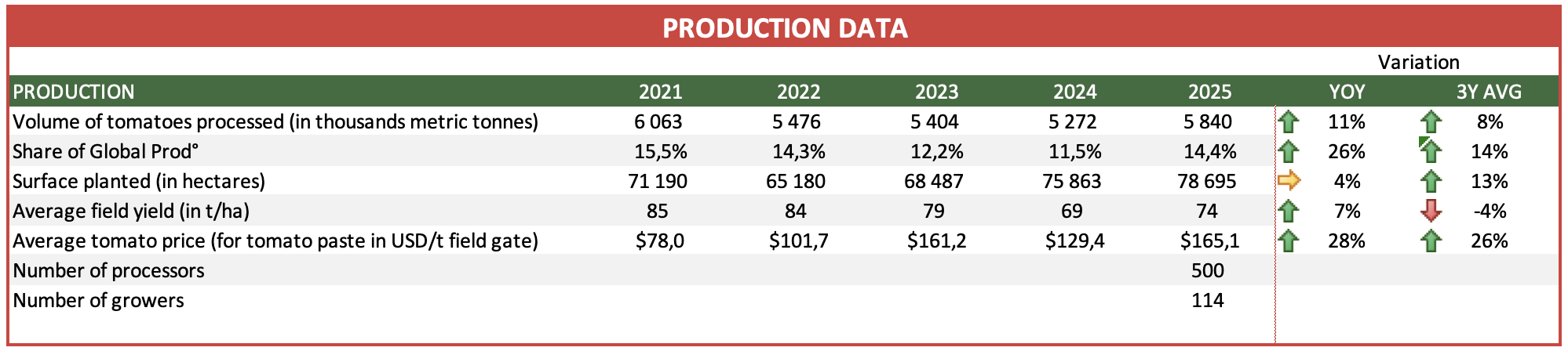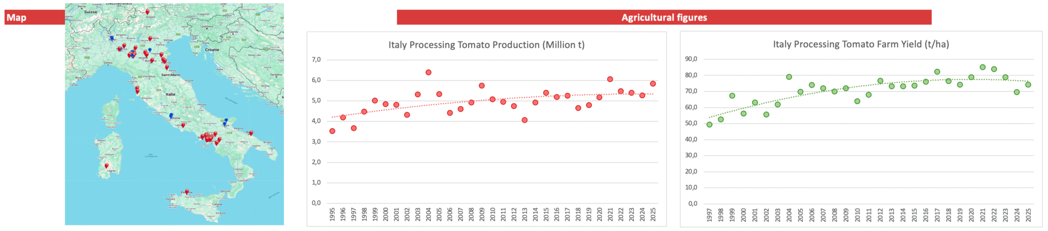 Approximately half of the total production is grown in Northern Italy, mainly around Parma, Piacenza, Ferrara, and smaller zones north of the Po River. In this area, about 36 thousand hectares of tomatoes for processing are cultivated every year with the involvement of about 2 thousand agricultural producers (grouped in 13 producer organisations) and 25 processing plants (belonging to 20 different companies) for the processing of about 2.5 million tonnes of tomatoes from which mainly concentrates, pulps and purees are produced. The climate is generally favourable, with strong day-night temperature differences enhancing fruit colour but risks include drought, hailstorms, and heavy rains which can reduce production as happened in 2024. Production is fully mechanized and with drip irrigation with yields averaging 75 t/ha. The whole production is either integrated (90%) or organic (10%) with a strong interprofessional organization, OI Pomodoro da Industria Nord Italia, assisting the growers and processors. About a third of the volume is processed into tomato paste, a quarter into passata, with a whole range of other products, either  directly into final packaging or in bulk.