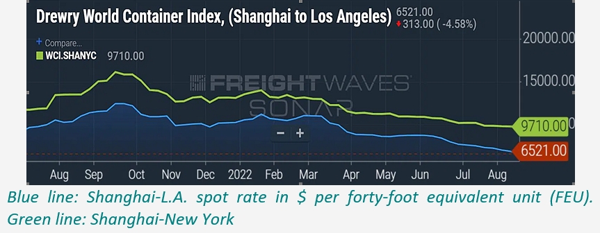 According to the specialized press, the price to ship containers of cargo eastbound from Asia to the U.S. across the Pacific continues to recede from record levels. In contrast, the price to ship containers westbound across the Atlantic from Europe has risen through 2022 and is still hovering near all-time highs.