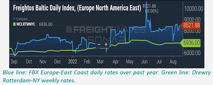 According to the indexes, it was more expensive in late August to move spot cargo westbound across the Atlantic from Europe to the East Coast than it was to move cargo eastbound across the Pacific from Asia to the West Coast — even though the sailing distance across the Pacific is almost twice as long. Drewry’s weekly assessment as of August 21 for the Rotterdam-New York route was USD 6,936 per FEU, up 8% year-on-year. The FBX Europe-East Coast index was at USD 8,522 per FEU, up 44% year-on-year.