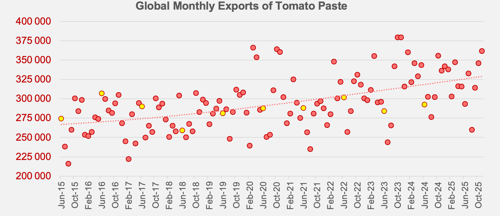 Comparison of monthly exports of tomato paste (HS code 200290) over past two years, comparison with the previous three marketing years (December – November periods)