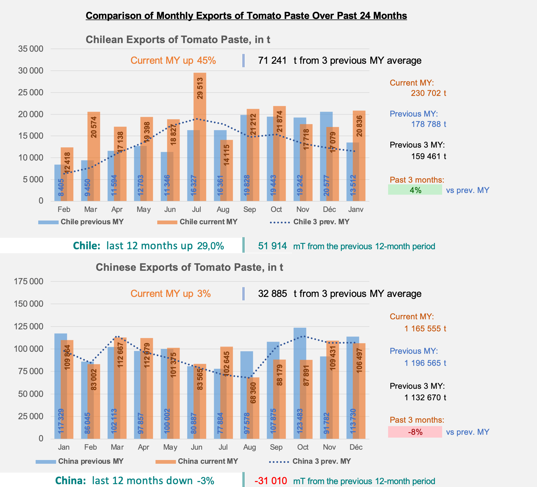 For each of the ten countries (China, Italy, Spain, USA, Portugal, Chile, Turkey, Greece, Iran and Austria) that play a significant role in international trade, Tomato News presents a comparison of the monthly performances for exports of tomato paste over past two years. For greater clarity, the histograms present (blue dotted lines) the curve of the average activity of the same months of the three previous marketing years.