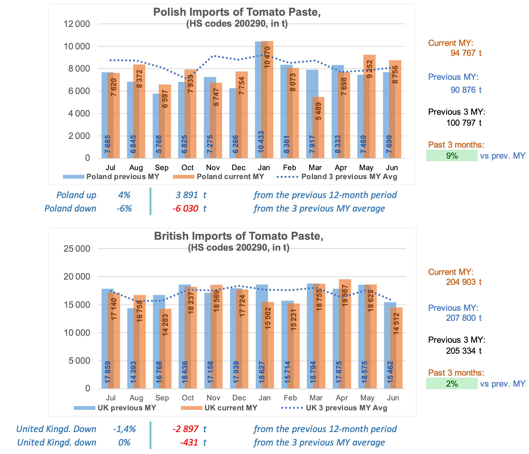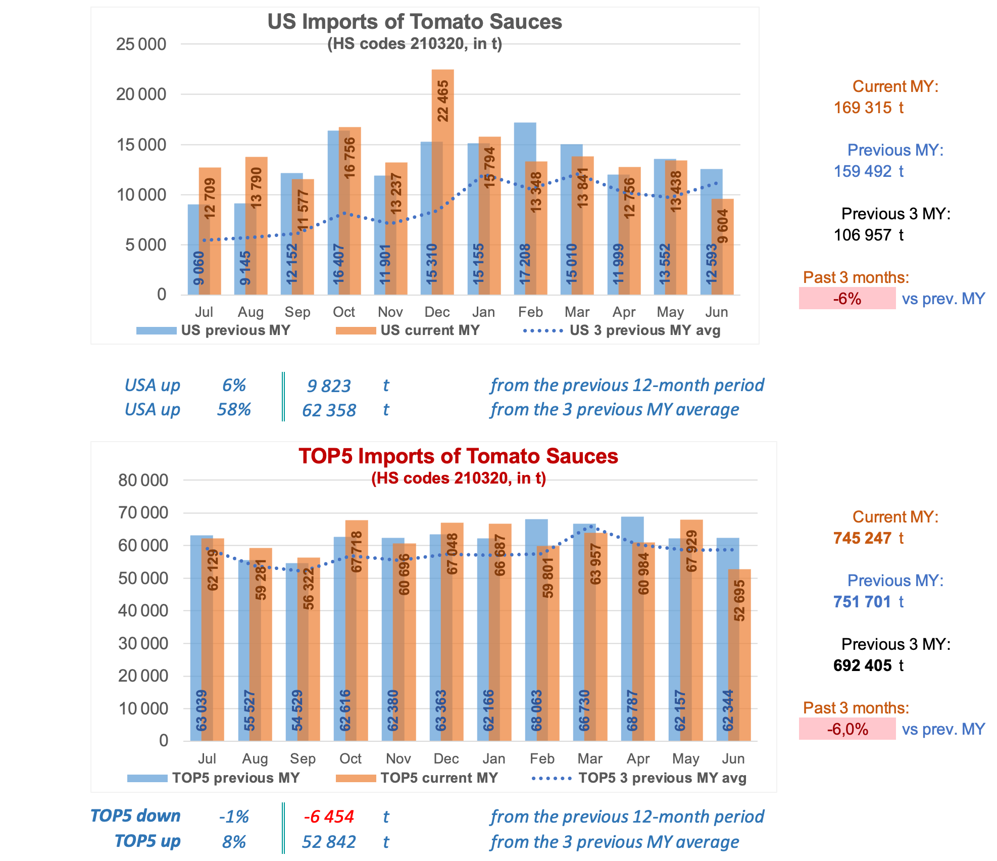 The quantities of tomato paste imported by the Top20 importing countries (*) over the past twelve months (June 2024 – May 2025, just under 1.69 million t) were approximately 57,966 mT (3.55%) higher than in the previous corresponding period (1.631 million mT), and 97,067 mT (6.16%) higher than the average of the same periods of the three previous marketing years (1.591 million mT).