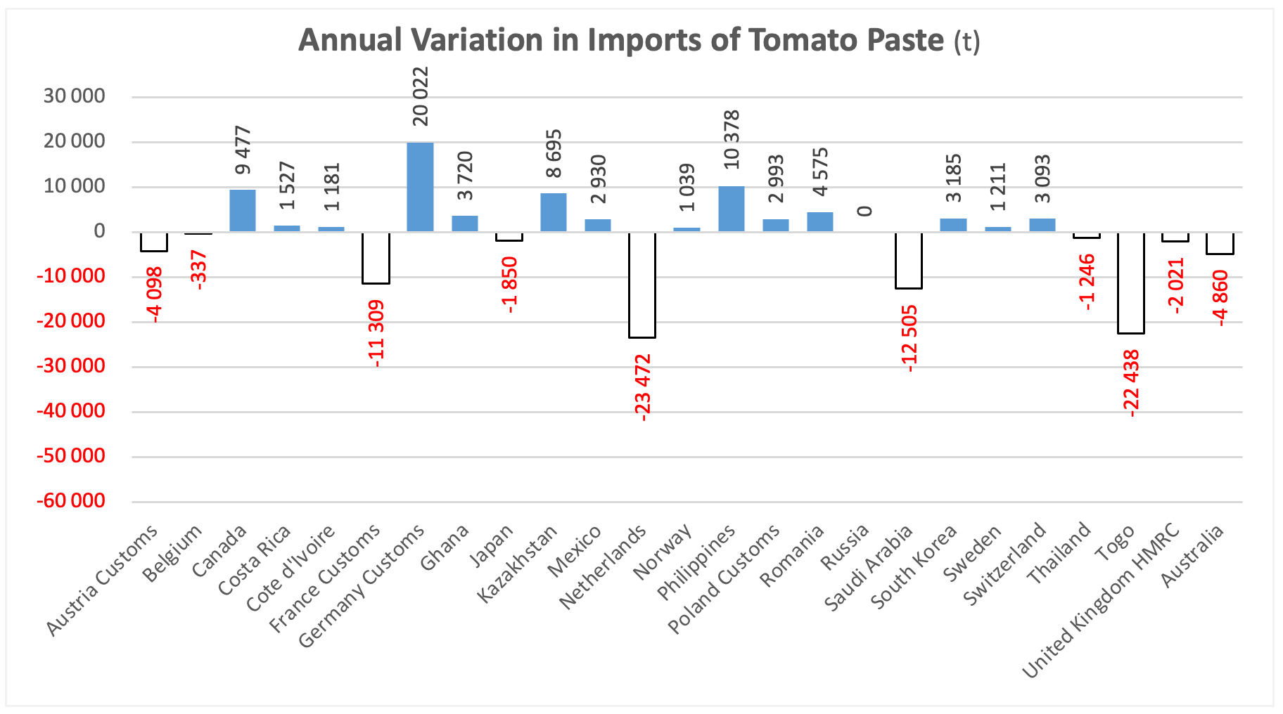 The following diagram presents the annual variations in tomato paste imports for the 20 main importing countries in the sector.