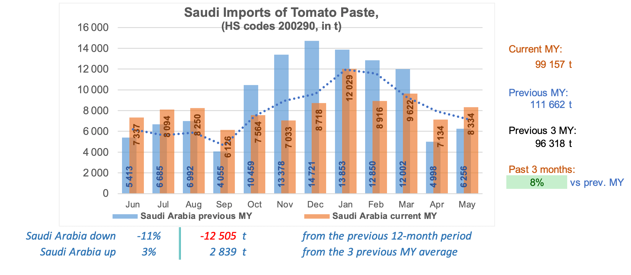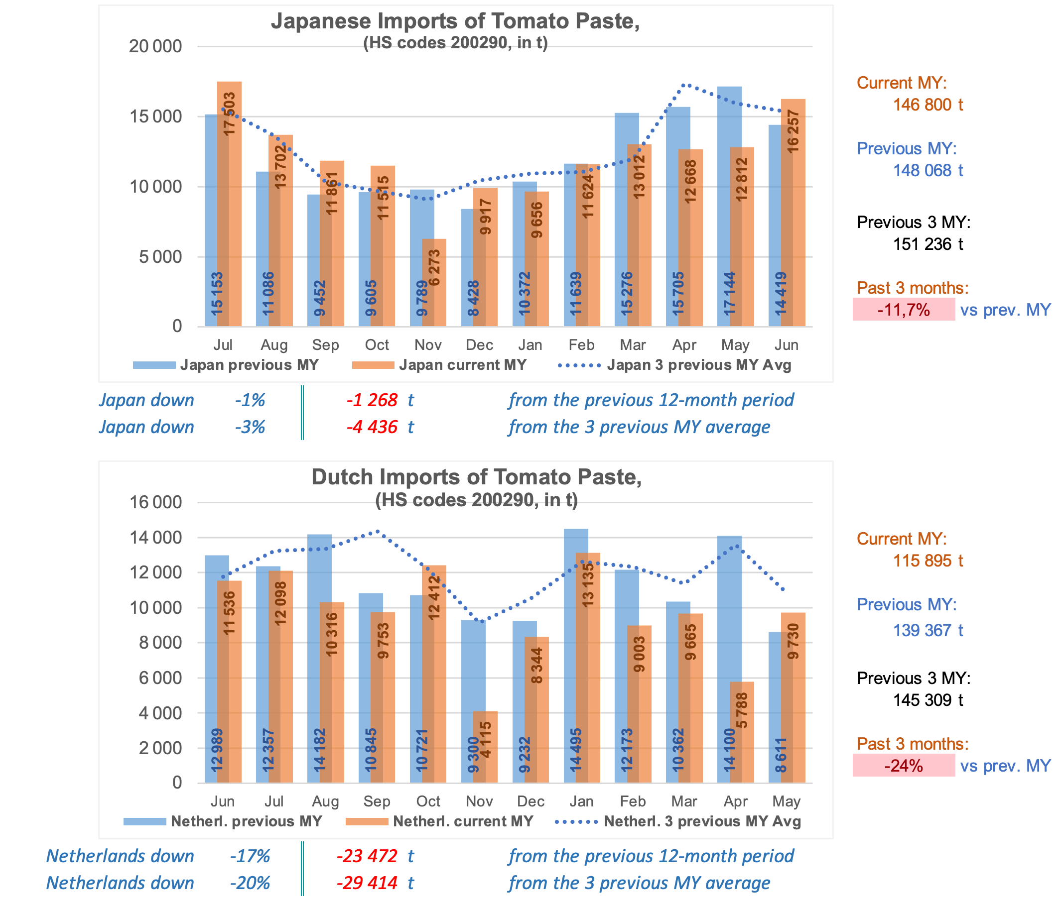 Imports of pastes to the twenty most dependent countries (whose domestic consumption depends solely on external supplies): for greater clarity, the histograms present as an additional reference the curve (blue dotted lines) of the average activity of the same months of the three previous marketing years.