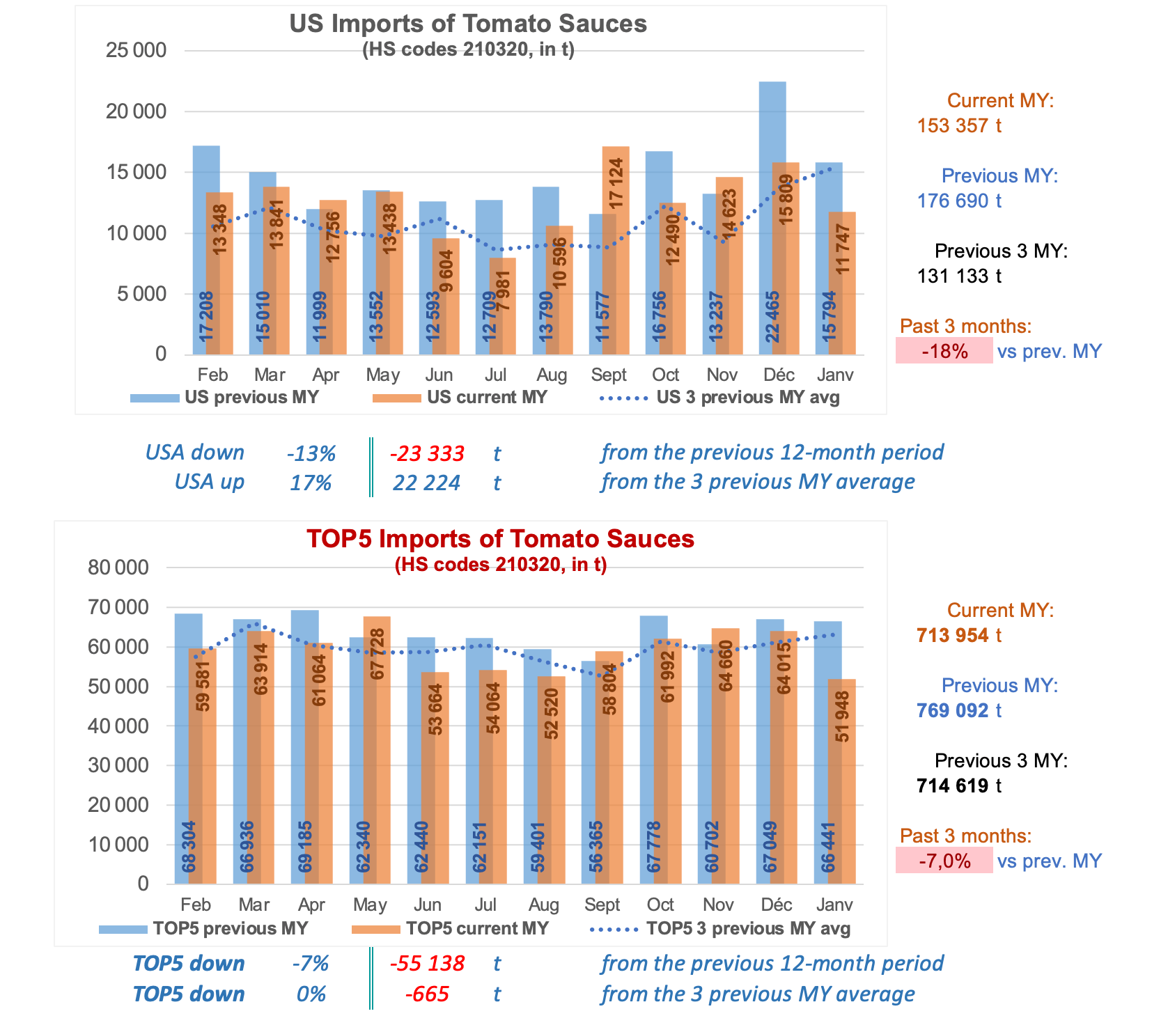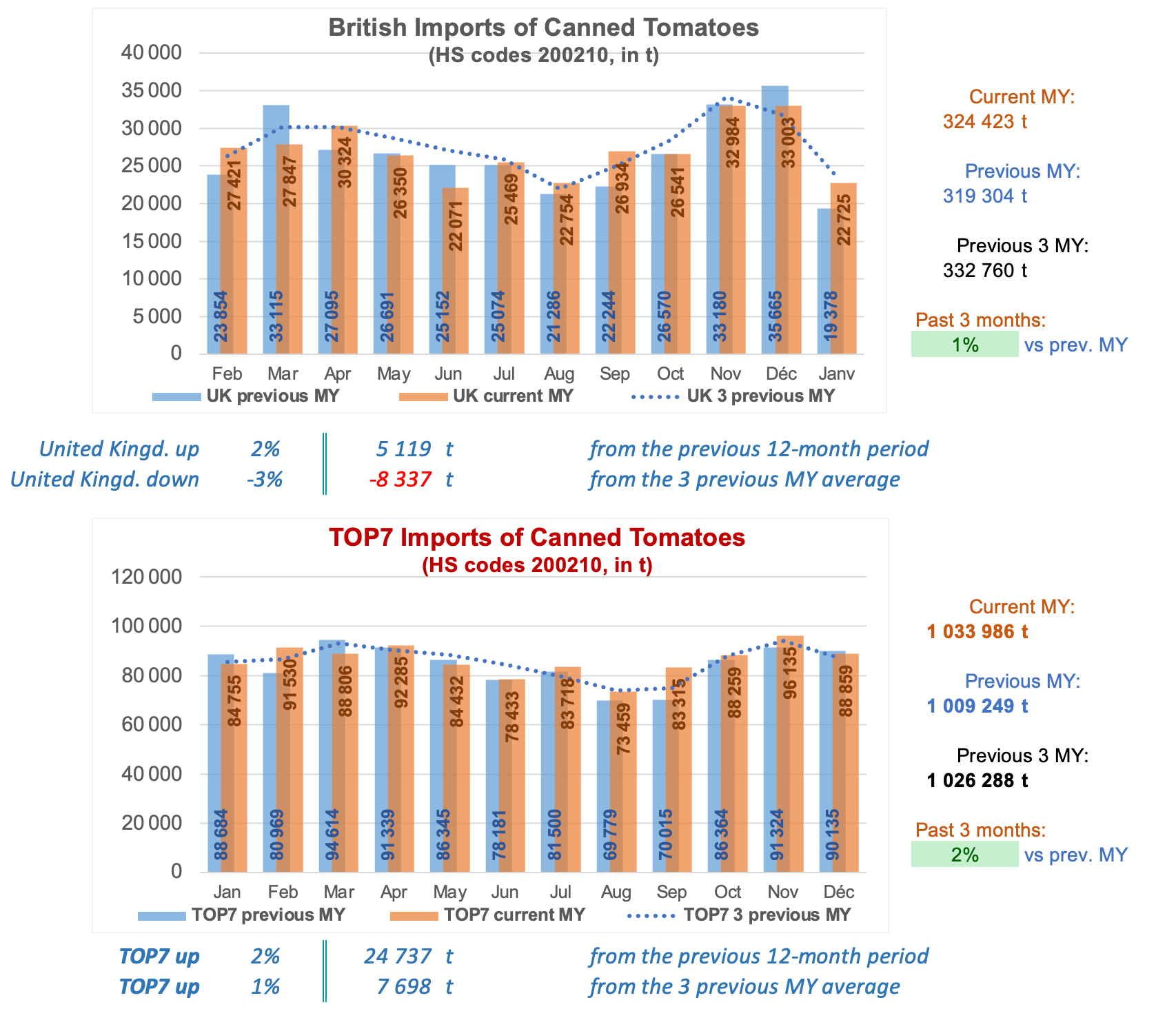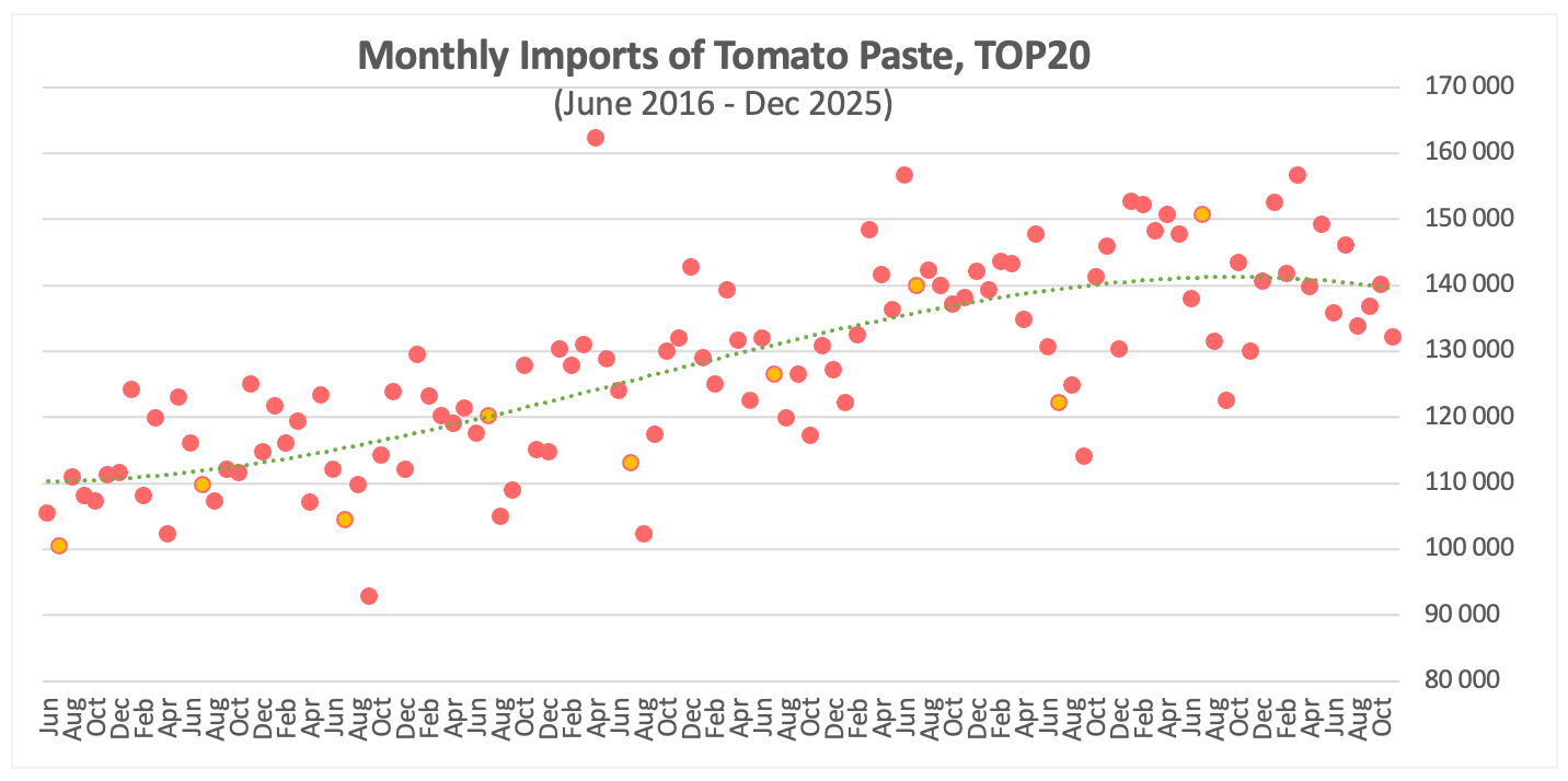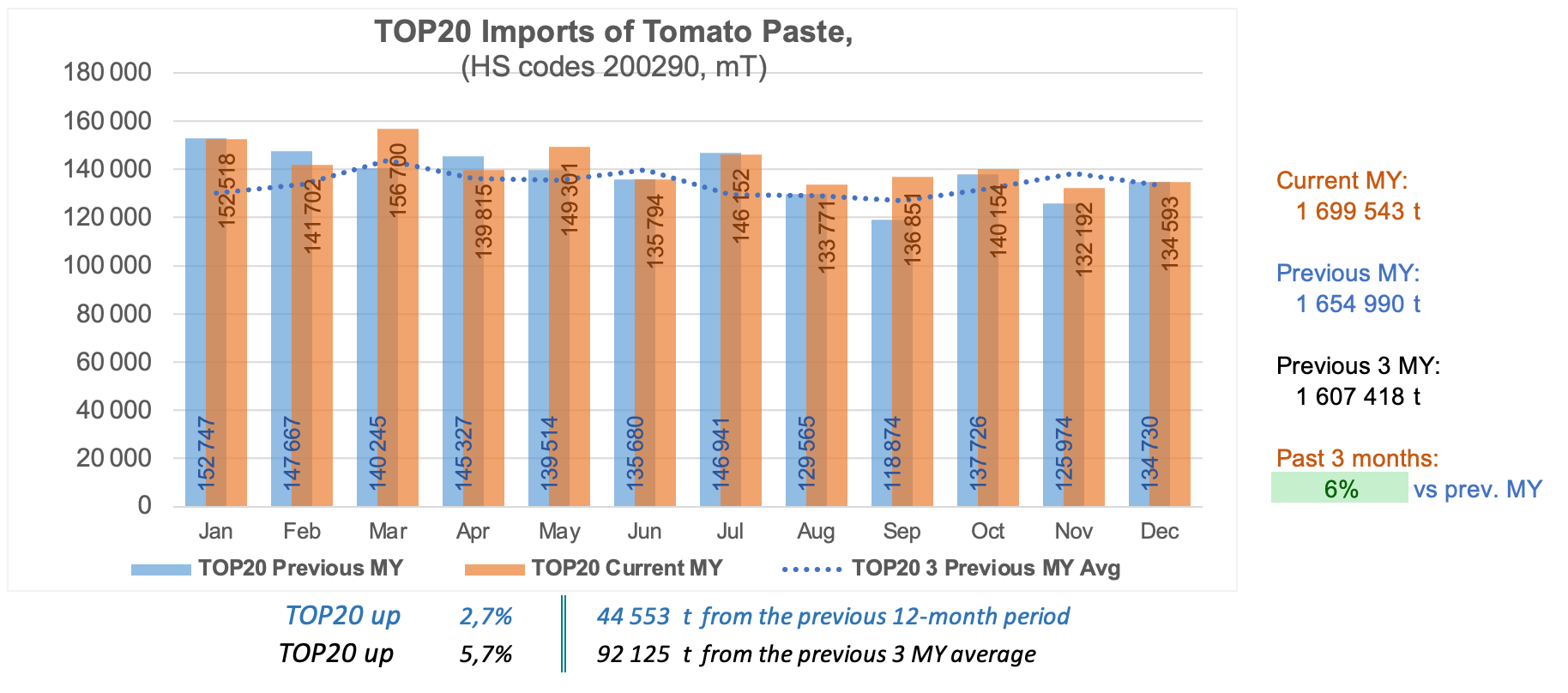 The quantities of tomato paste imported by the Top20 importing countries (*) over the past twelve months (January 2025 – December 2025, just under 1.7 million t) were approximately 44,553 mT (2.69%) higher than in the previous corresponding period (1.654 million mT), and 92,125 mT (5.73%) higher than the average of the same periods of the three previous marketing years (1.607 million mT).