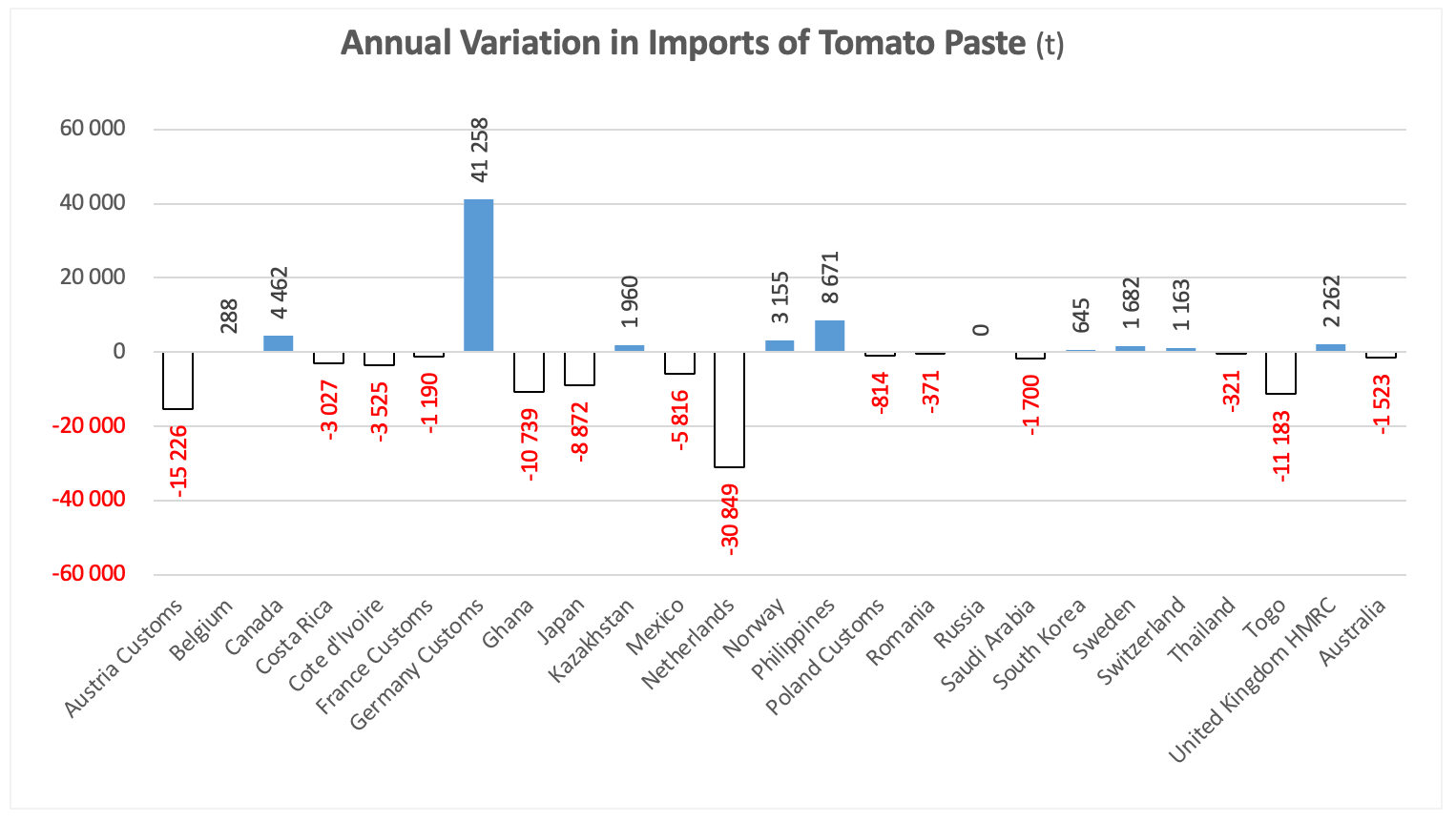 The following diagram presents the annual variations in tomato paste imports for the 20 main importing countries in the sector.