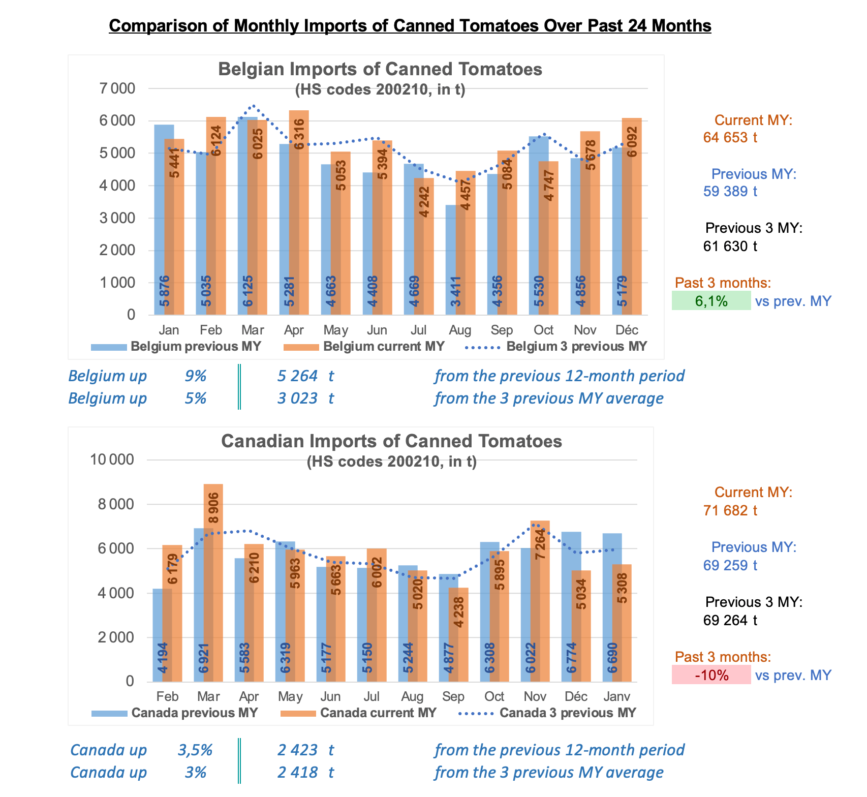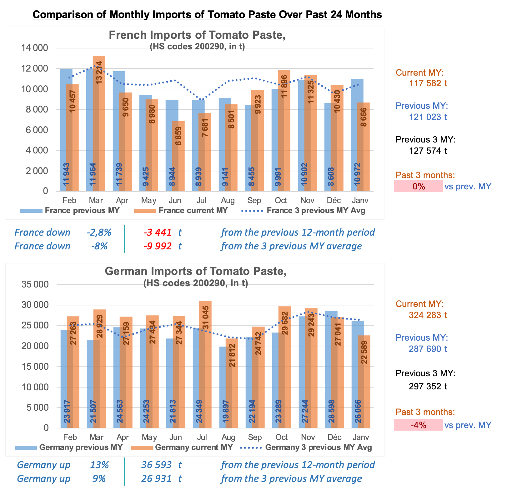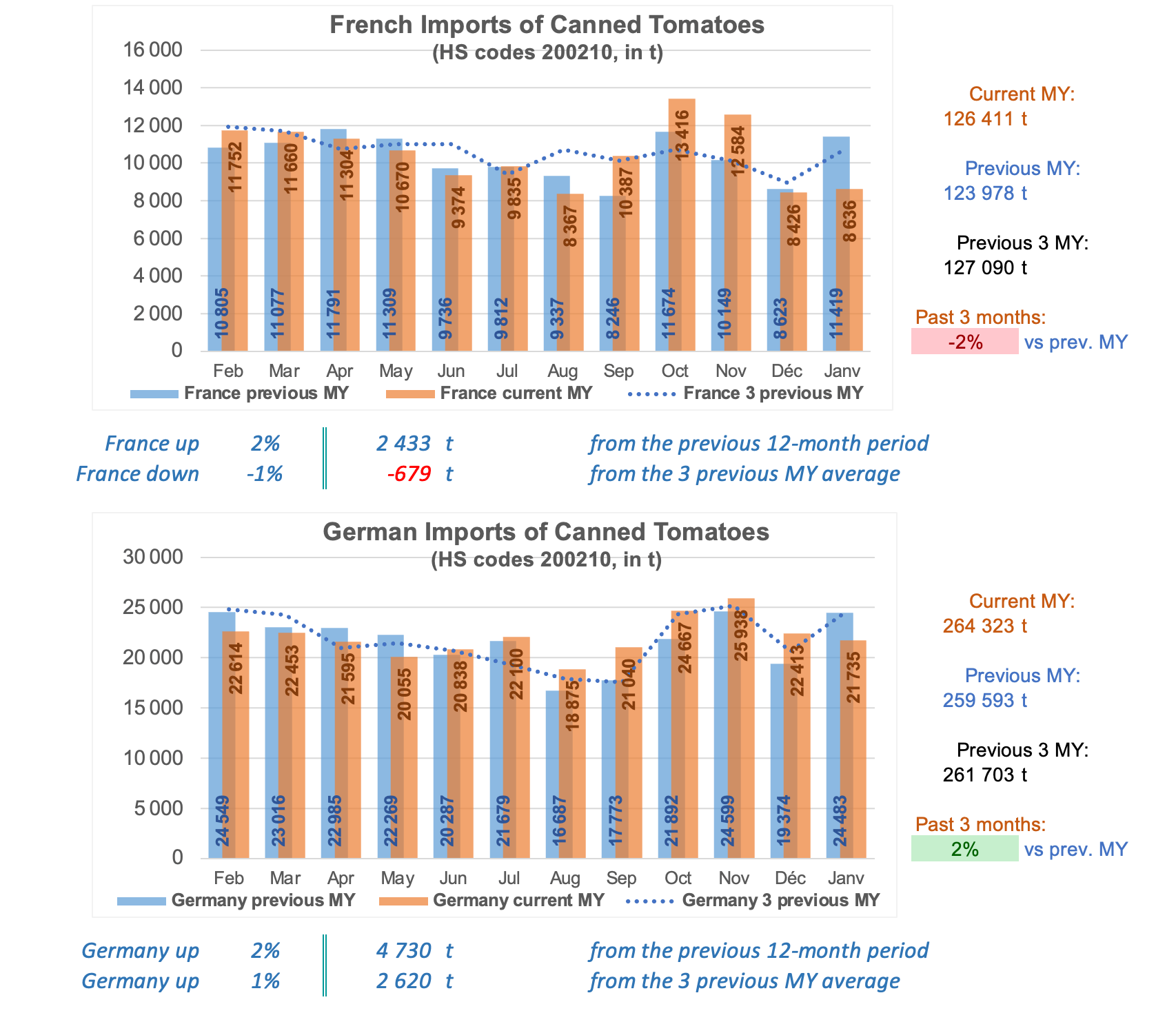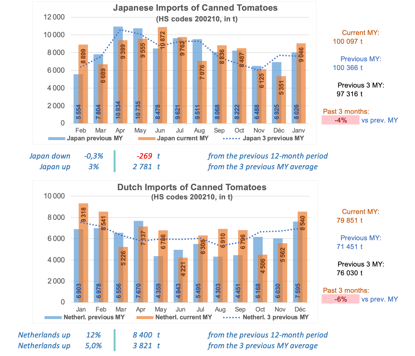 Along with its monthly summaries of the prices for pastes and canned tomatoes and of the performances of the world’s main tomato paste exporting countries (see linked articles below), Tomato News is presenting updated figures of the supply volumes shipped each month by the main consumer markets for tomato products.