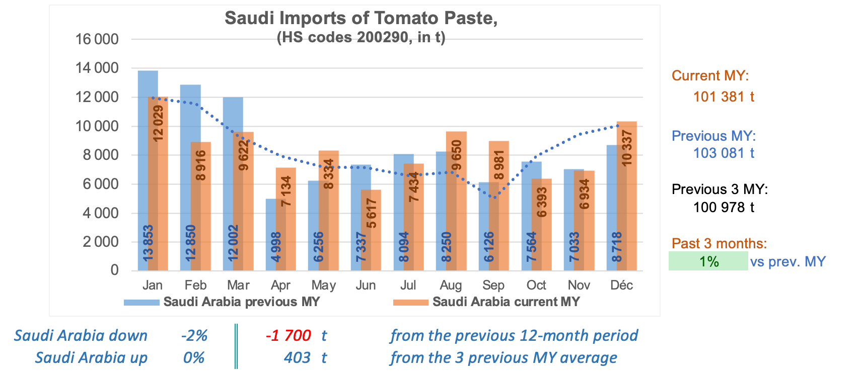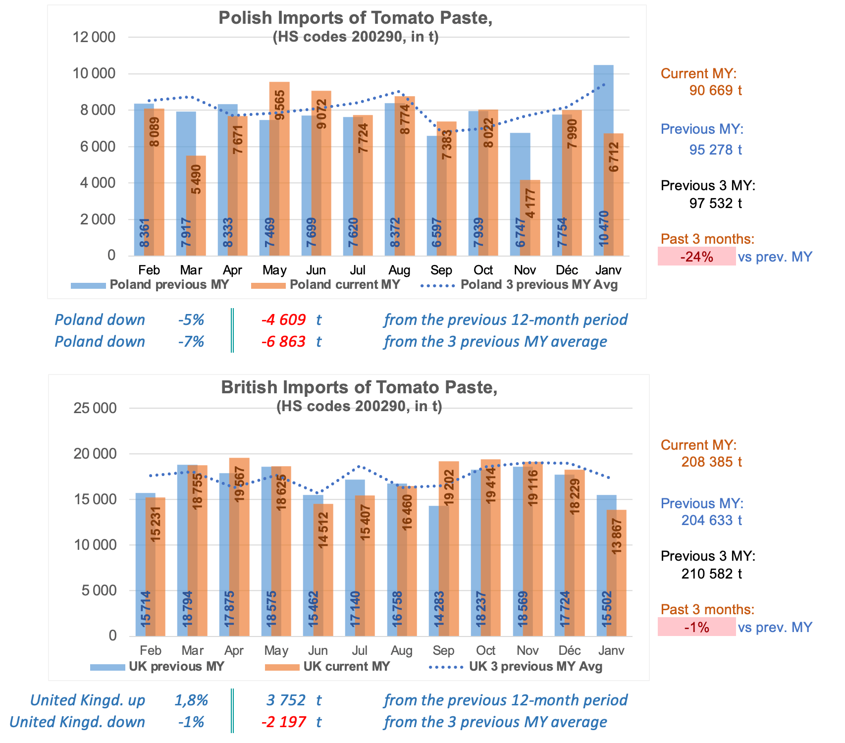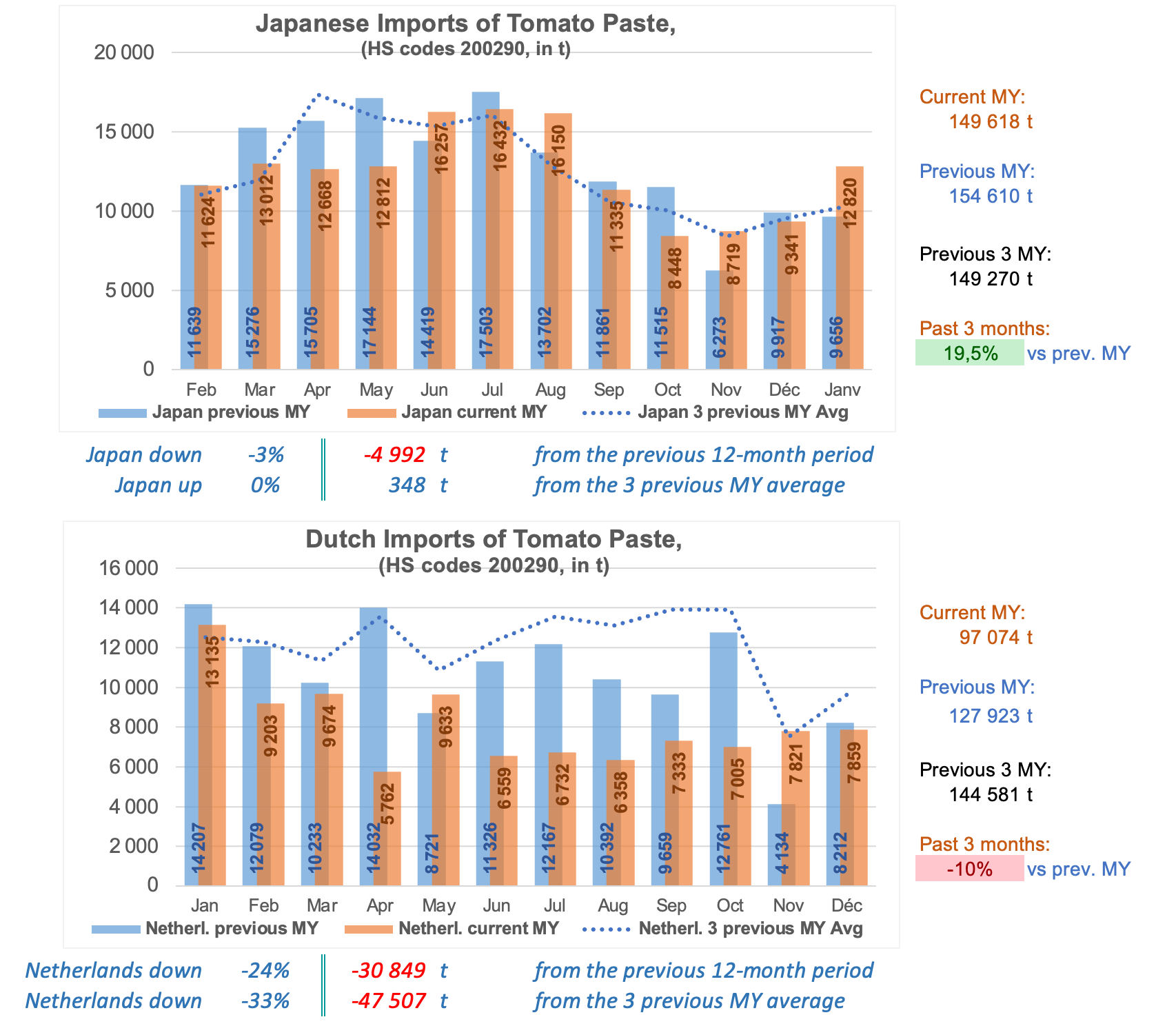 Imports of pastes to the twenty most dependent countries (whose domestic consumption depends solely on external supplies): for greater clarity, the histograms present as an additional reference the curve (blue dotted lines) of the average activity of the same months of the three previous marketing years.