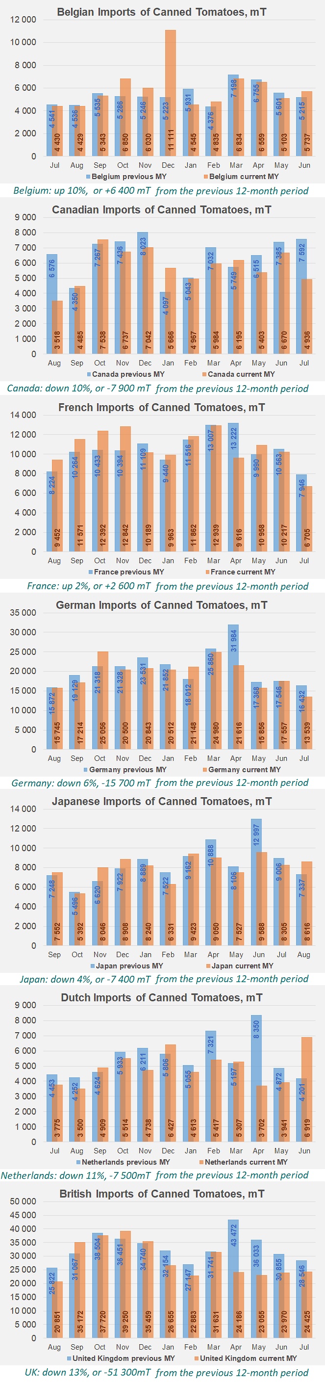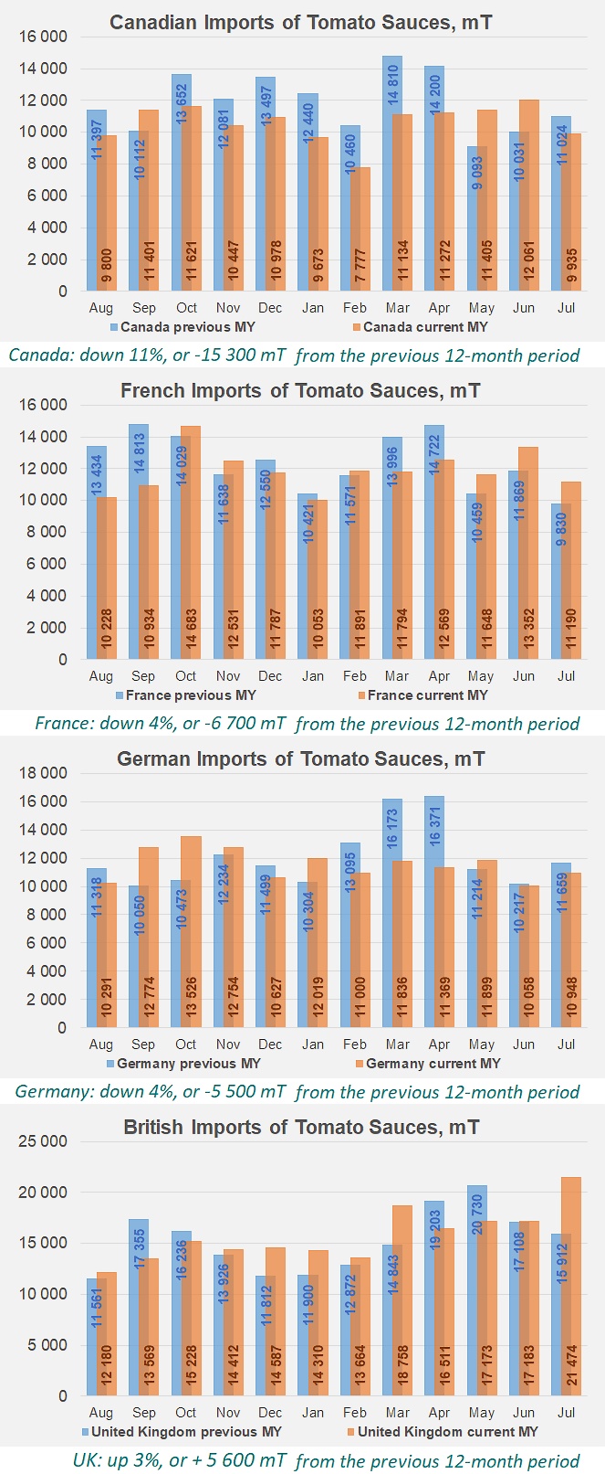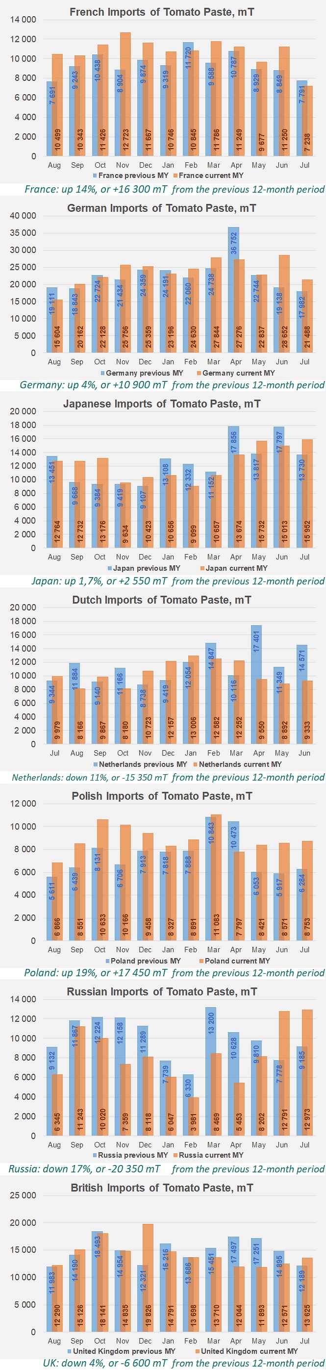 For tomato paste, alongside the combined figures for the Top20 importing countries, this article presents data for France, Germany, Japan, the Netherlands, Poland, Russia and the United Kingdom; canned tomato imports for Belgium, Canada, France, Germany, Japan, the Netherlands and the UK; and finally sauces & ketchup imports for Canada, France, Germany and the United Kingdom. This provides a regular and representative overview of the situation and trends of global demand.