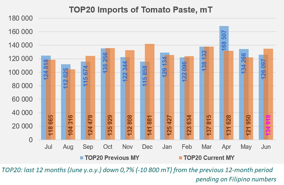 The total quantities of tomato paste imported worldwide over the past twelve months (July 2020 – June 2021) were approximately 69,000 mT (3%) higher than in the previous corresponding period.