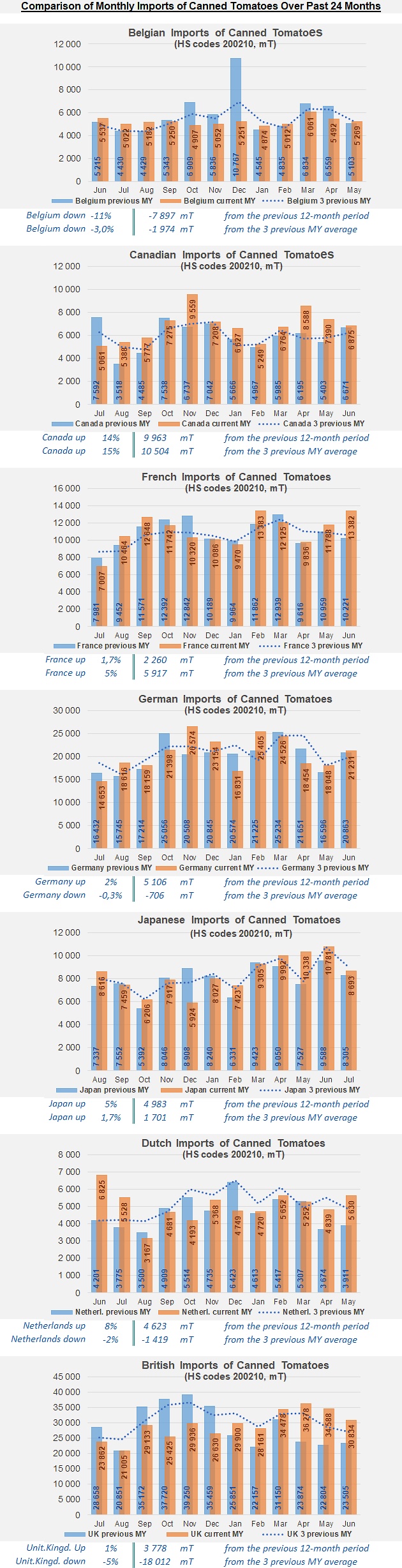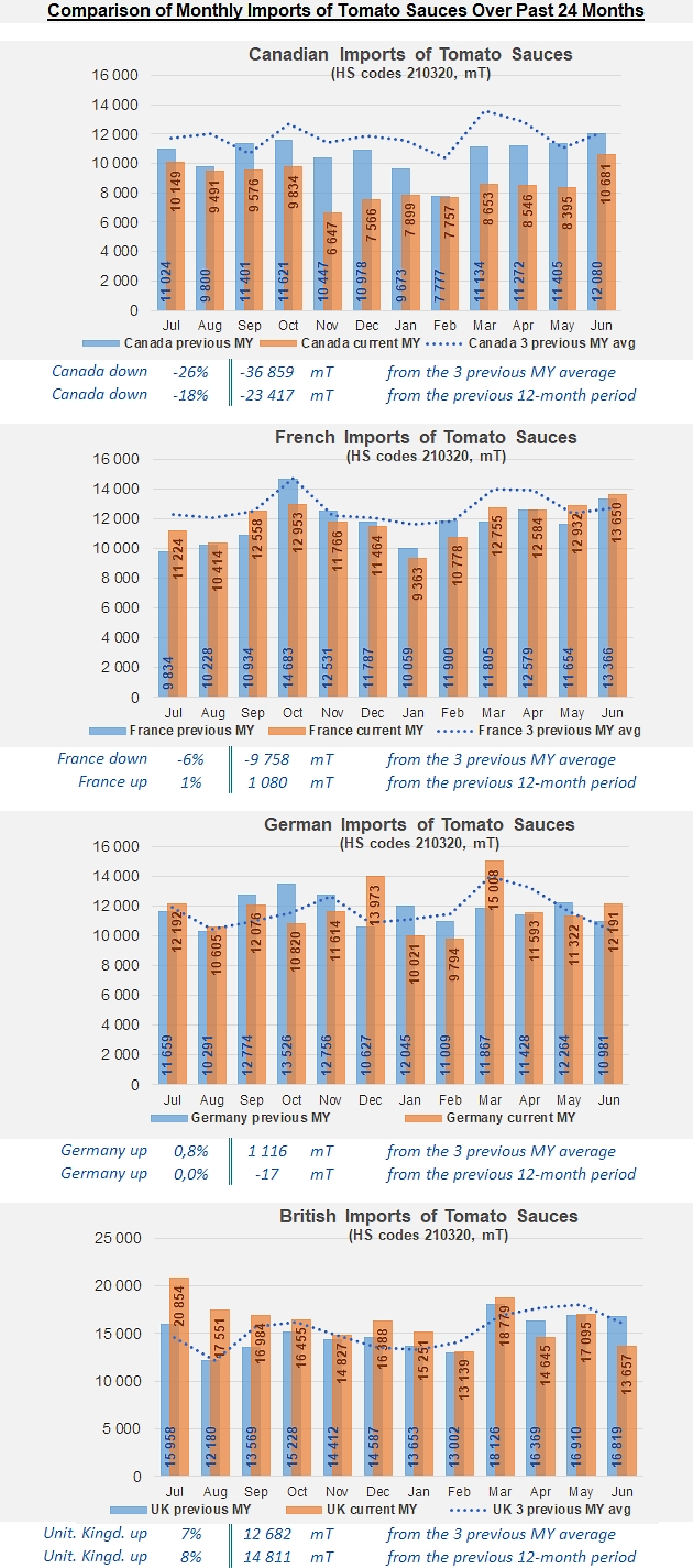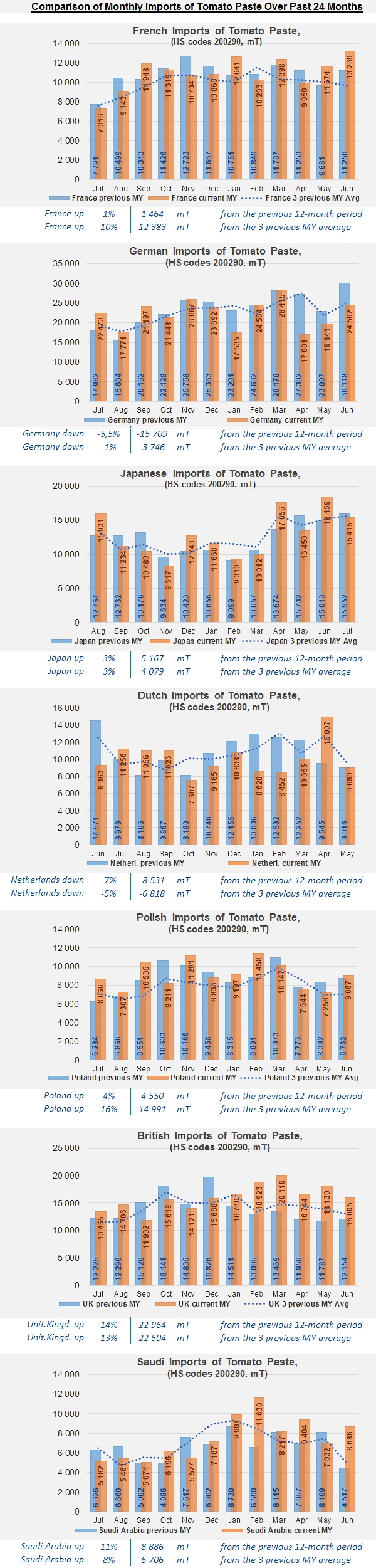 For tomato paste, alongside the combined figures for the Top20 importing countries, this article presents data for France, Germany, Japan, the Netherlands, Poland, Russia and the United Kingdom; canned tomato imports for Belgium, Canada, France, Germany, Japan, the Netherlands and the UK; and finally sauces & ketchup imports for Canada, France, Germany and the United Kingdom. This provides a regular and representative overview of the situation and trends of global demand.