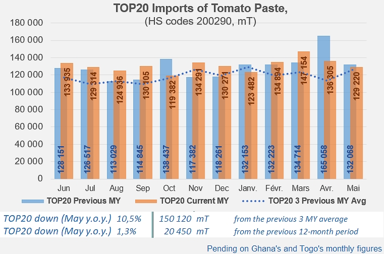 The total quantities of tomato paste imported by the Top20 importing countries (*) over the past twelve months (1.573 million mT, June 2021 – May 2022, pending on secondary results) were approximately 20,000 mT (1.3%) higher than in the previous corresponding period (1.552 million mT), and 150,000 mT (10.5%) higher than the average of the same periods of the three previous marketing years (1.423 million mT).