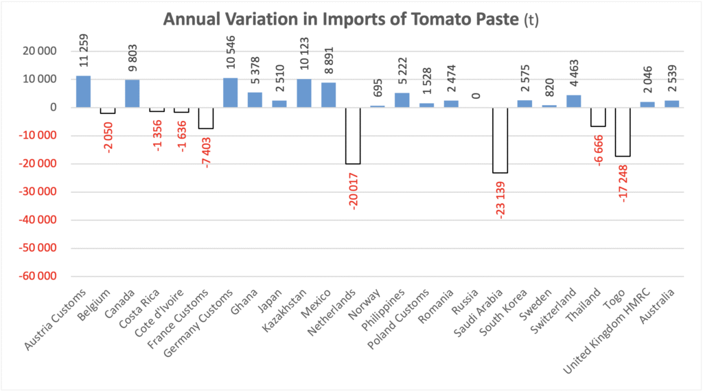 The following diagram presents the annual variations in tomato paste imports for the 20 main importing countries in the sector.
