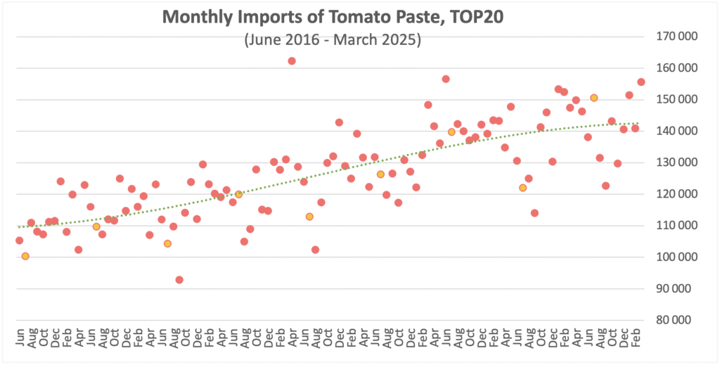 The quantities of tomato paste imported by the Top20 importing countries (*) over the past twelve months (April 2024 – March 2025, 1.7 million t) were approximately 68,035 mT (4.17%) higher than in the previous corresponding period (1.632 million mT), and 102,361 mT (6.67%) higher than the average of the same periods of the three previous marketing years (1.594 million mT).