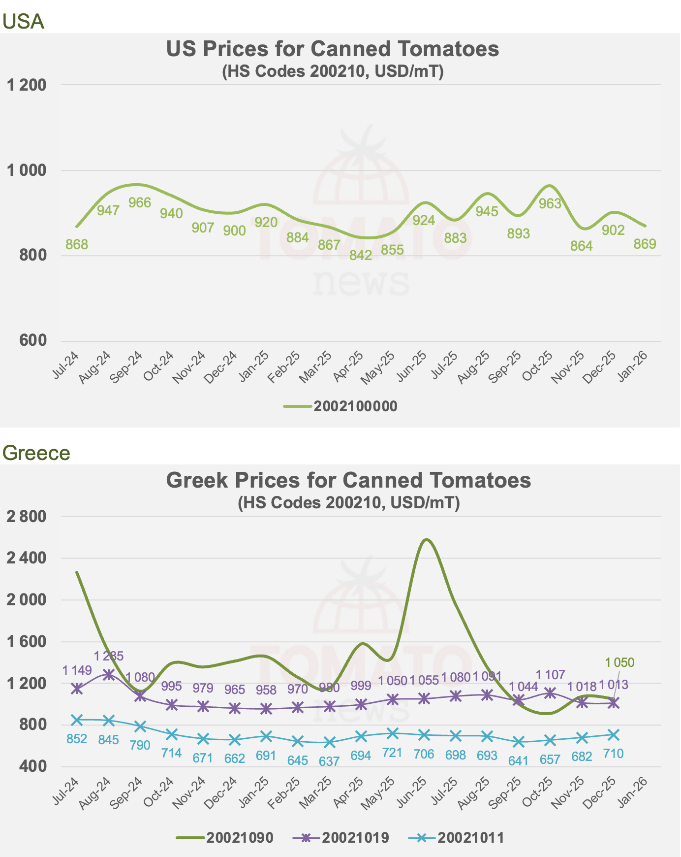 For each of the five countries that play a significant role in international trade (Italy, Spain, USA, Greece and Portugal), Tomato News presents the average monthly unit values of exports (in USD/t) that are available for the past eighteen complete month for each category segment (customs codes of 8 digits or more), representative of the foreign trade operations of these countries.