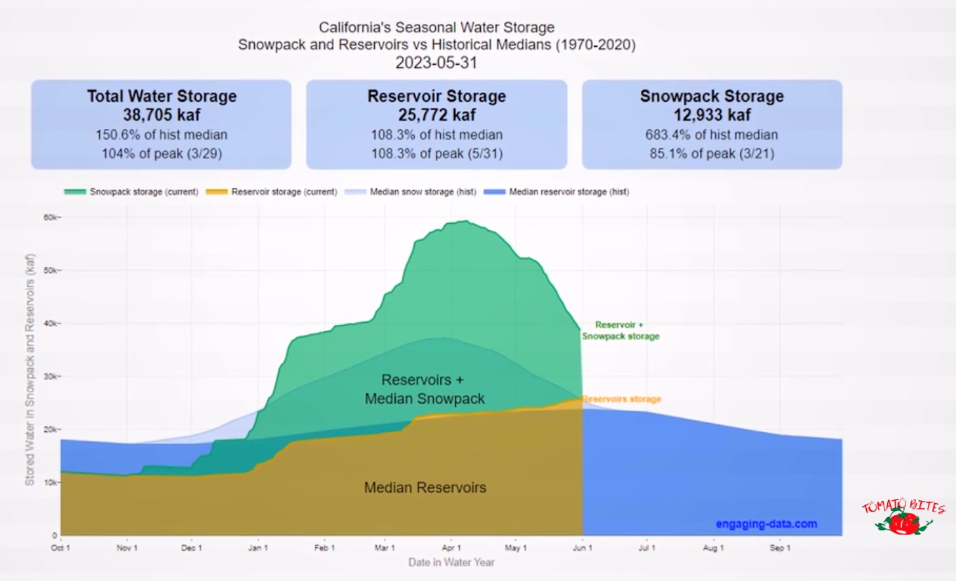 This year’s crop is highlighted by the 21st April announcement of 100% surface water allocation for growers from both Federal and State Water Project. This allocation is a stunning reversal from what was the final 2022 allocation of just 5%. The flush water situation this year allows processing tomato acreage to ramp up while the Sustainable Groundwater Management Act continues to clamp down on groundwater pumping on the long path of sustainable use. The record Sierra’s snowpack is still lingering in the high elevations, sitting at six times the historical median for this time of the year.