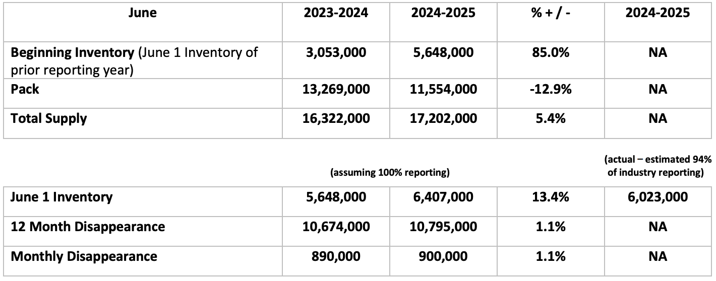 The U.S. bulk tomato paste-for-sale inventory on June 1, 2025 was approximately 3.18 million t (3.5 million tons), on a raw product “paid-for tons” equivalent basis.Listed below are the 2024-2025 Bulk Tomato Paste and Bulk Tomato “Paste for Sale” pack and inventory estimates as of June 1, 2025 for U.S. Tomato Processors. The 2024-2025 U.S. Processed Tomato Supply and Movement reported is based on an estimated 99% of the industry reported data for bulk tomato paste.