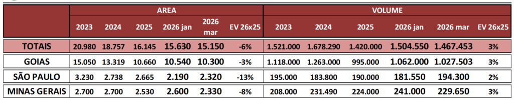 Projections for surfaces and volumes in Brazil for the 2026 crop