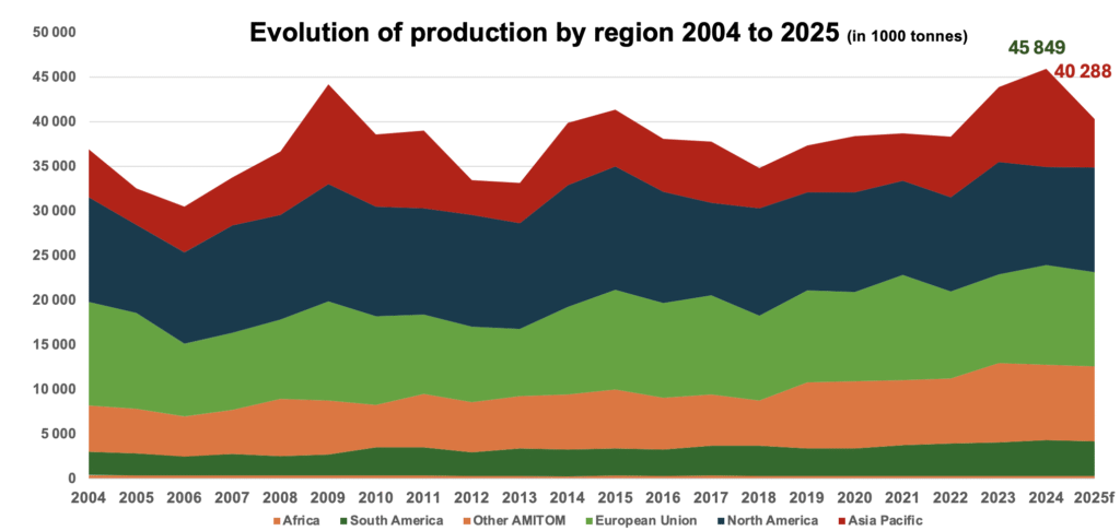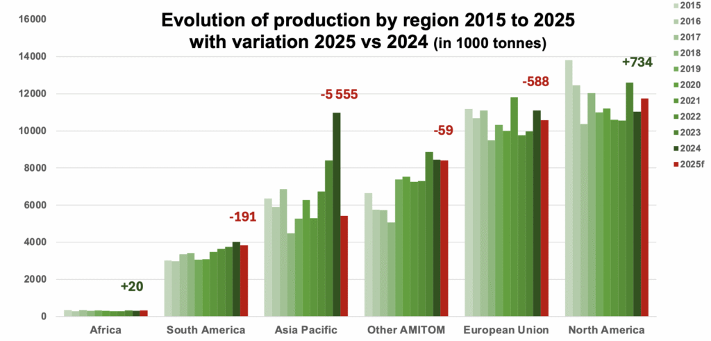 The main changes are a large reduction of the production in the AsiaPacific region (mainly in China), with a smaller drop in the European Union, while production in North America increases.
