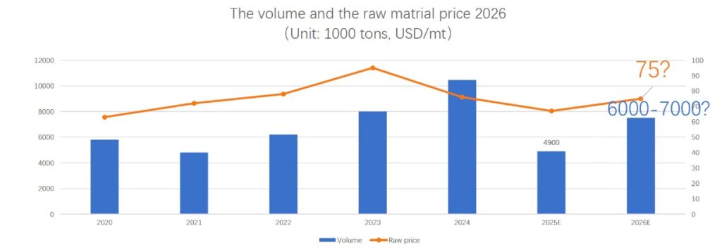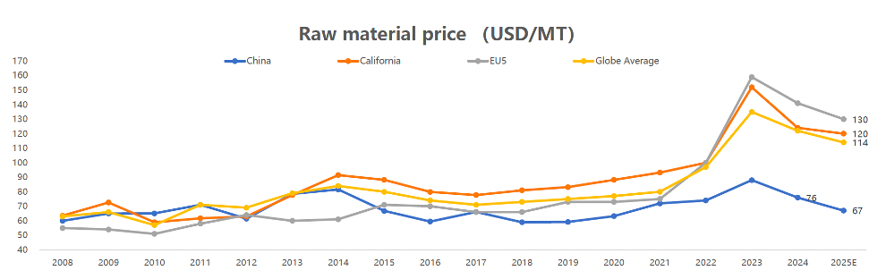 Up to on 30th September,the raw material price for China in 2025 is 67 USD/t. This is an increase of 2 USD/t compared to May 2025, but compared to 2024, it dropped by 9 USD/t.