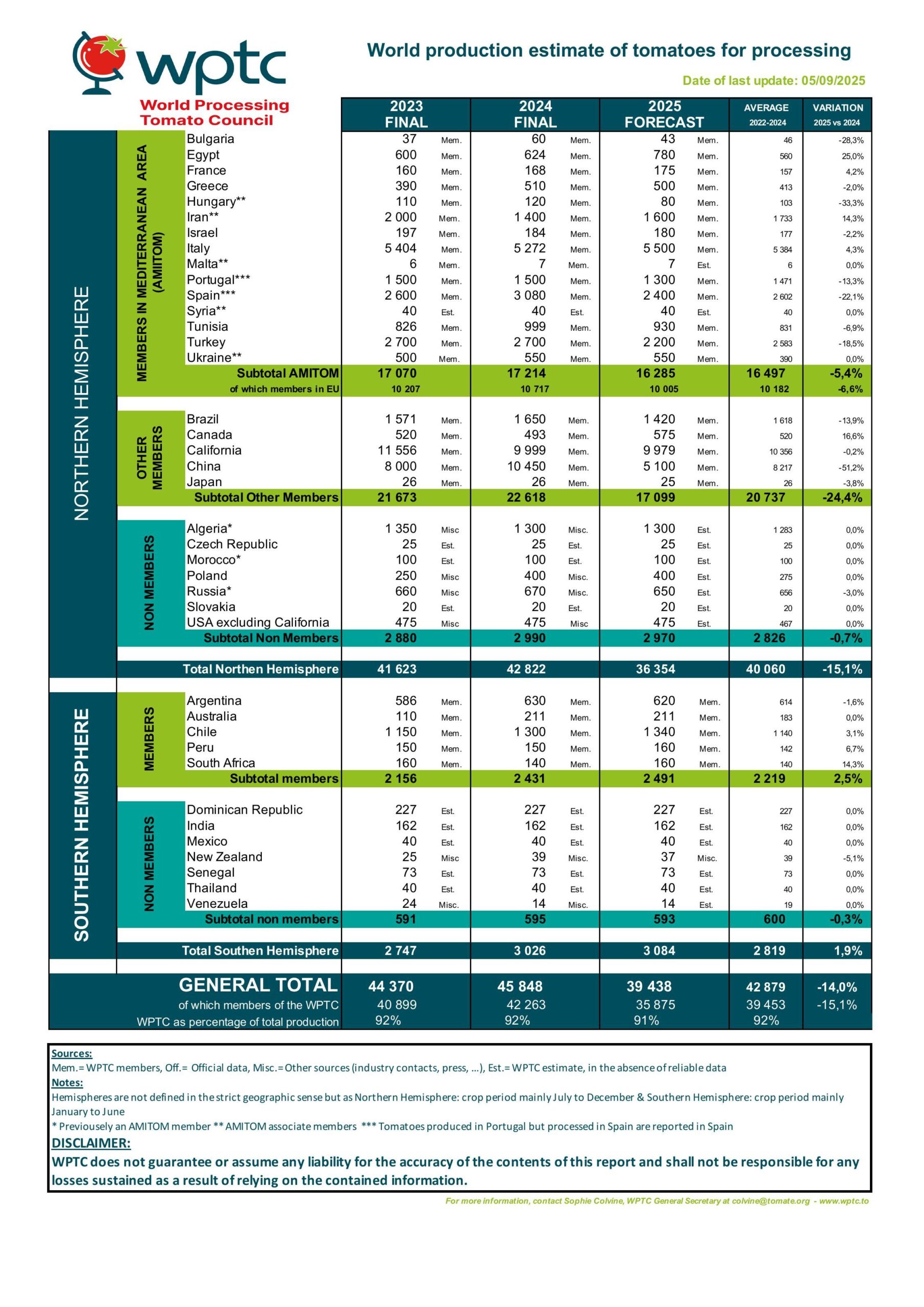 Due to weather problems like cold temperatures which are below averages this season, a reduction of about 14% in the tomato crop compared to 2024 season or 7% below the previous numbers for the current season is expected. The revised forecast for 2025 is thus 1.42 million tonnes.