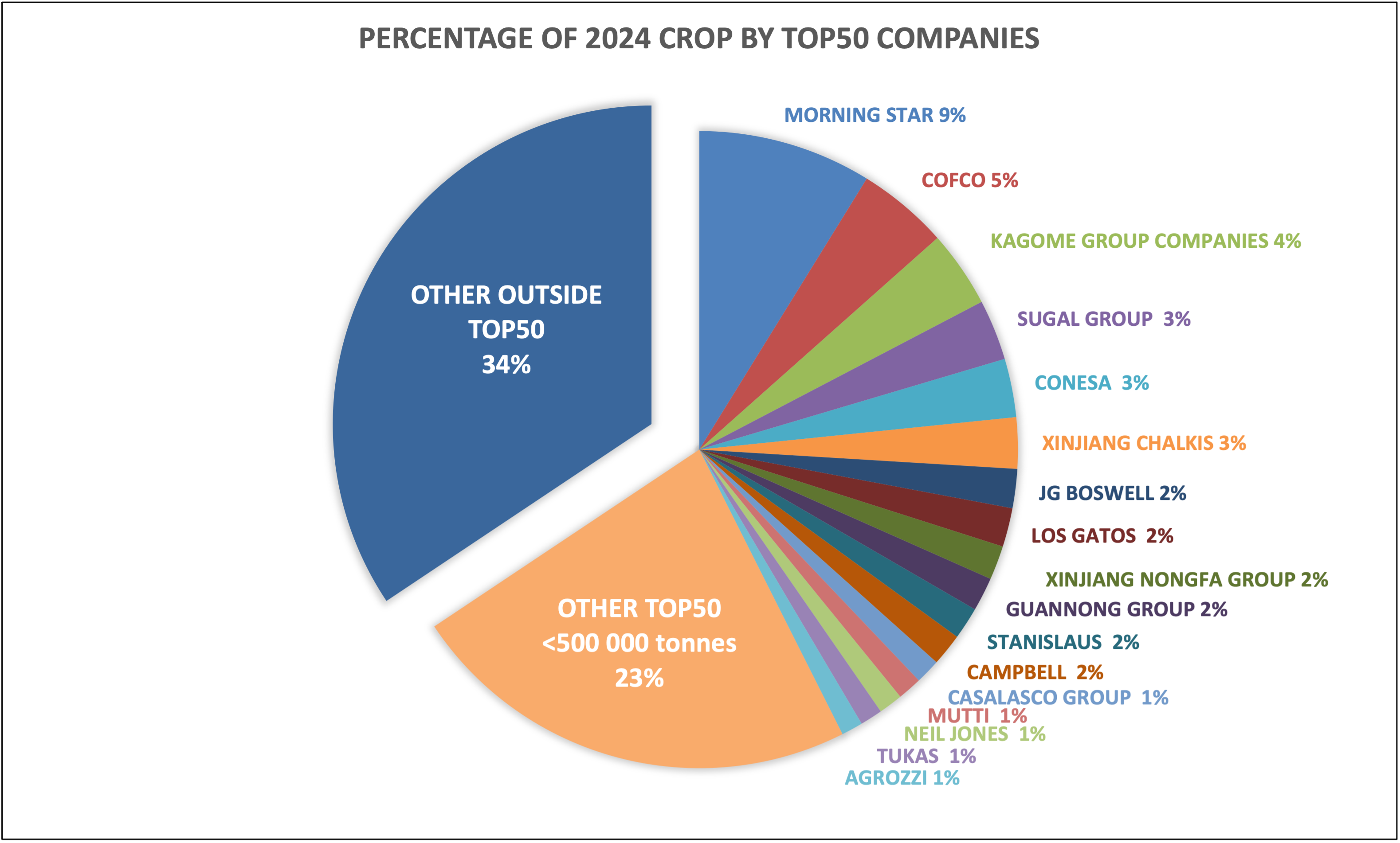 According to data we have collected by contacting processing companies and experts in different countries, the fifty largest tomato processing companies, for which we have direct information or estimates, processed 30 million metric tonnes of tomato in 2024, which is two-thirds the total volume processed globally.