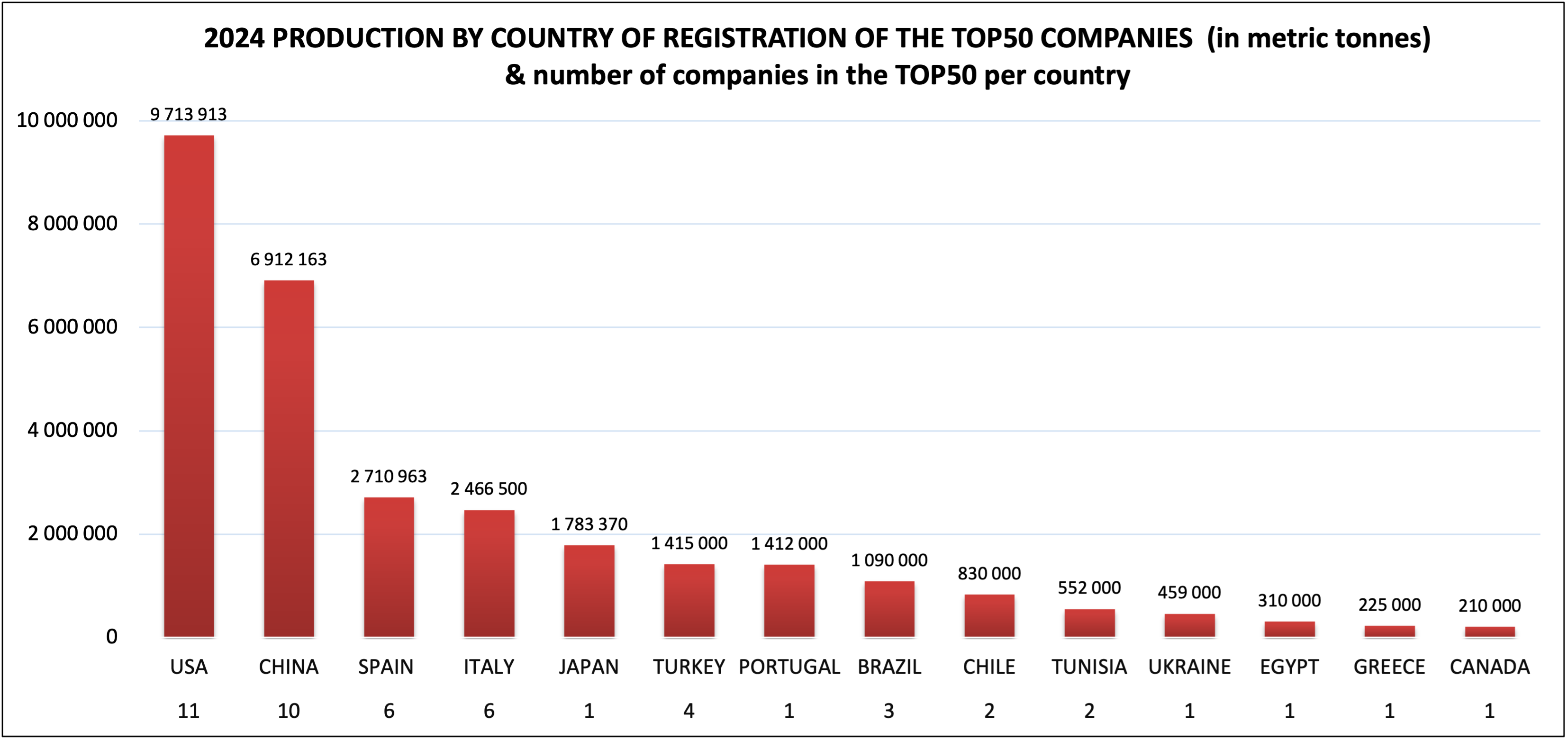 If we look at the individual countries, 11 of the TOP 50 are registered in the USA (10 of which in California), with 10 in China. Most of the other companies are in Europe, with 5 in South America (Brazil & Chile), 3 in North Africa (Tunisia & Egypt), and only one in Asia (Japan, where N°2 Kagome is headquartered, although most of its volume is processed on other continents).